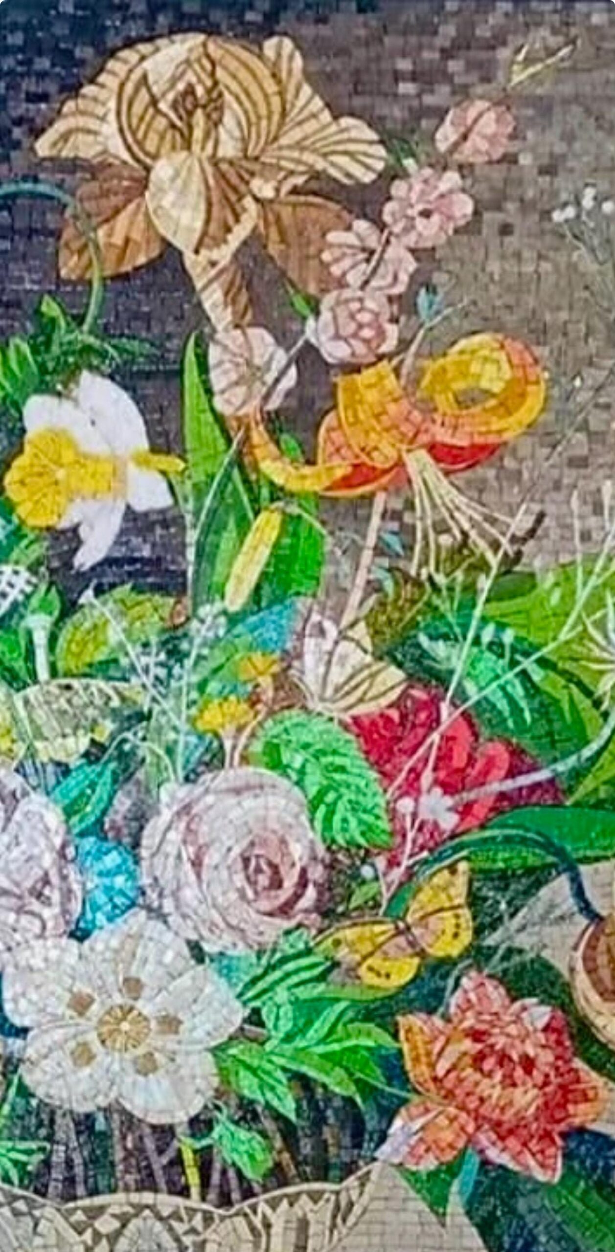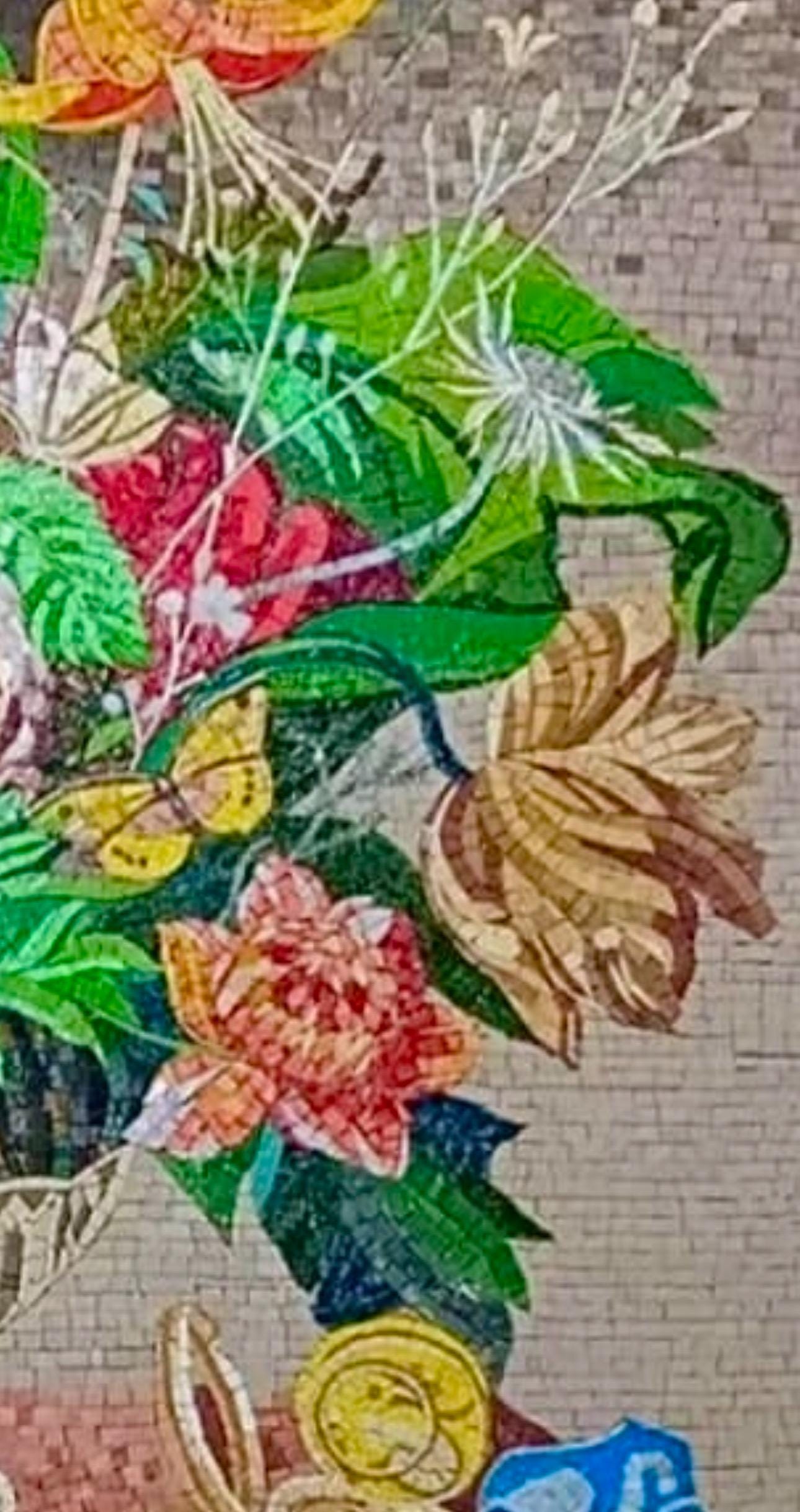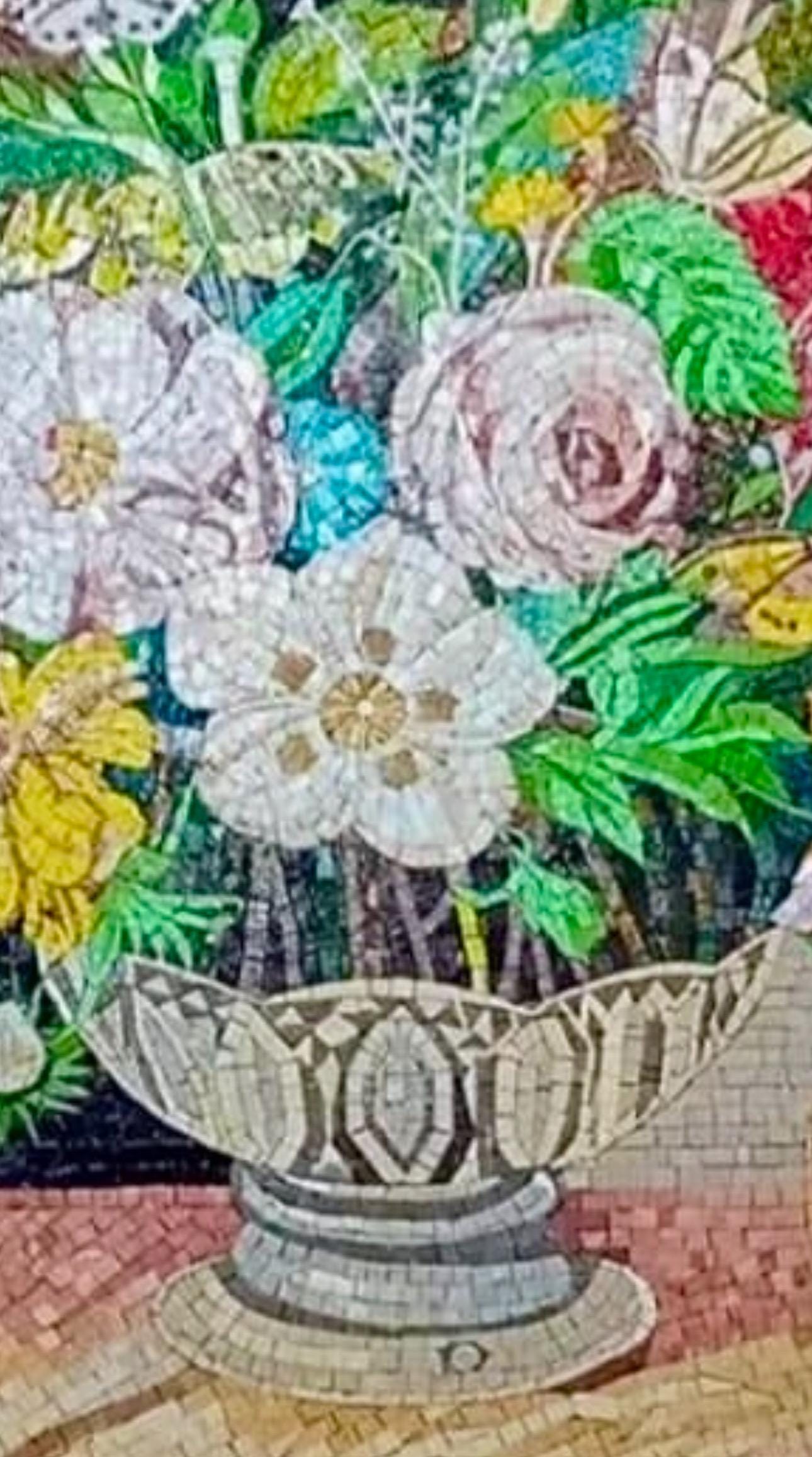 This exquisite handmade mosaic artwork features a graceful arrangement of blooming flowers in a classic stone vase, resting on a richly detailed surface. The design includes vibrant yellows, soft pinks, whites, and earthy tones, carefully balanced to create a timeless floral composition.