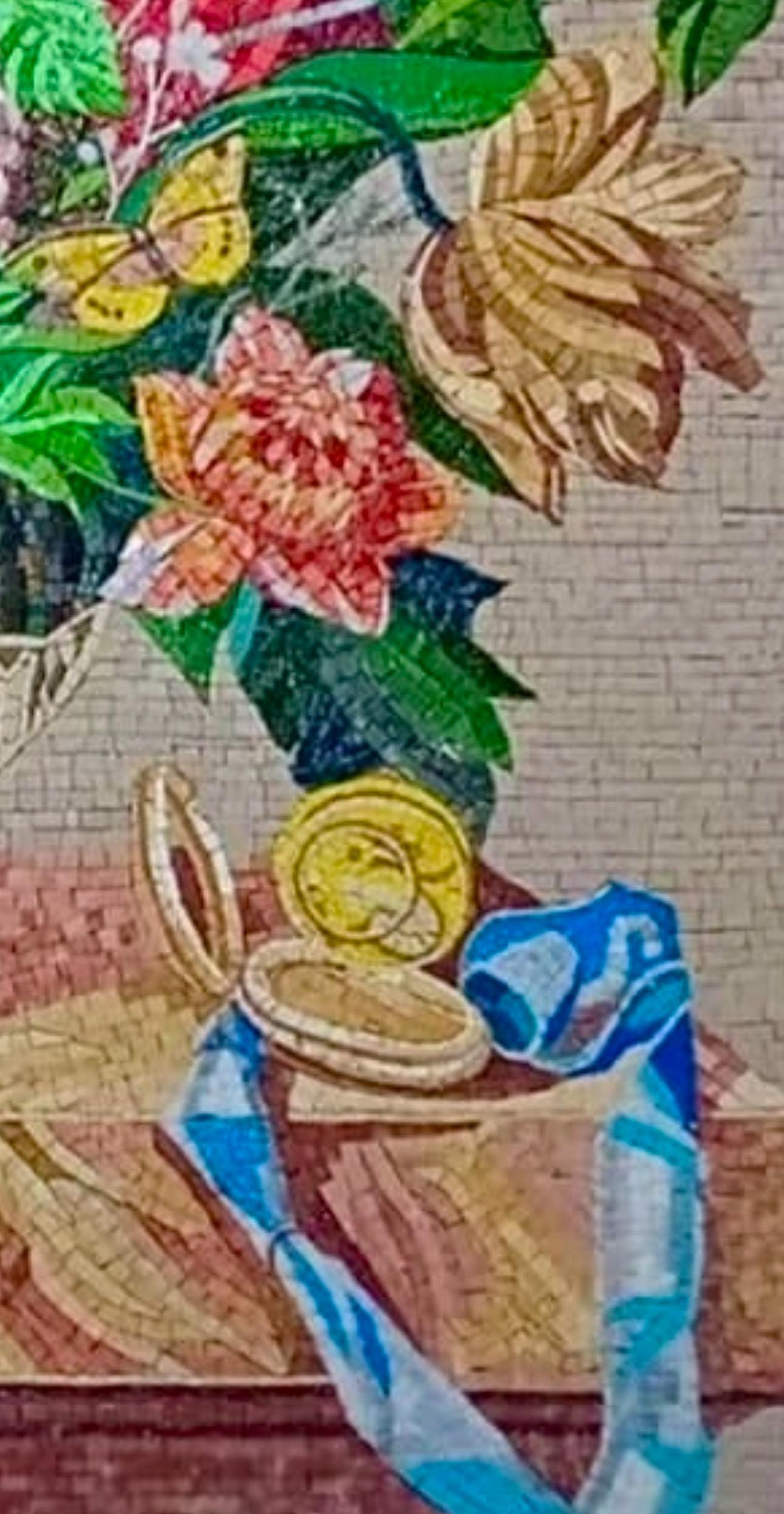 Crafted with hand-cut natural stone and marble, this mosaic radiates sophistication and luxury. The golden and earthy background tones bring warmth and depth, while fine details like the watch and ribbon on the table add character, making this piece an heirloom-quality work of art.