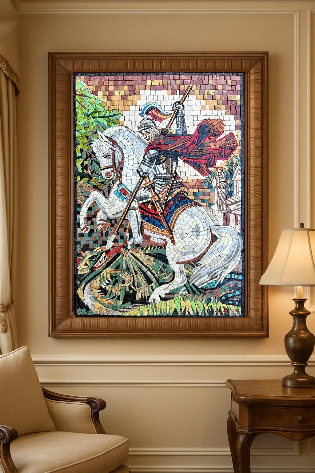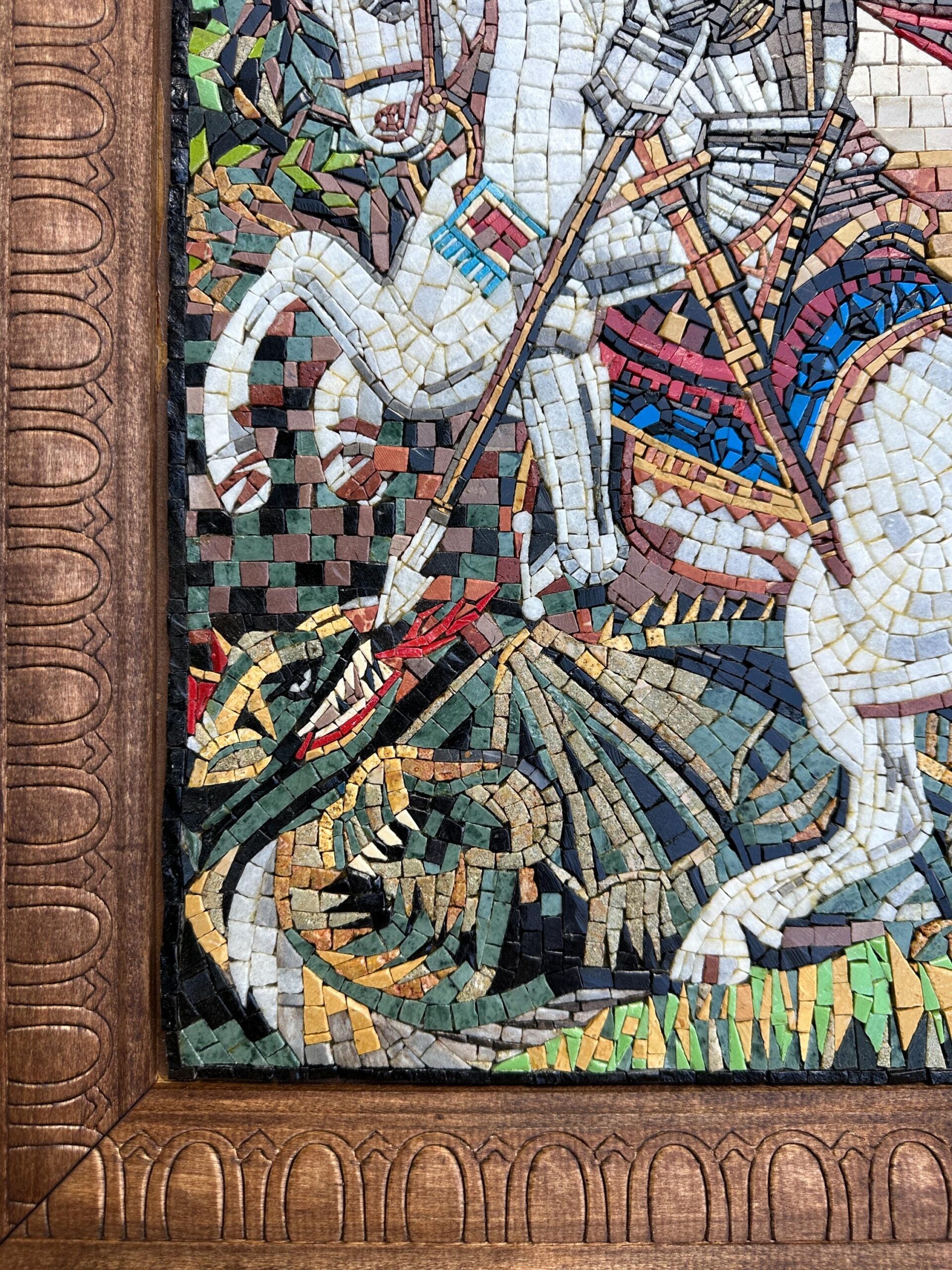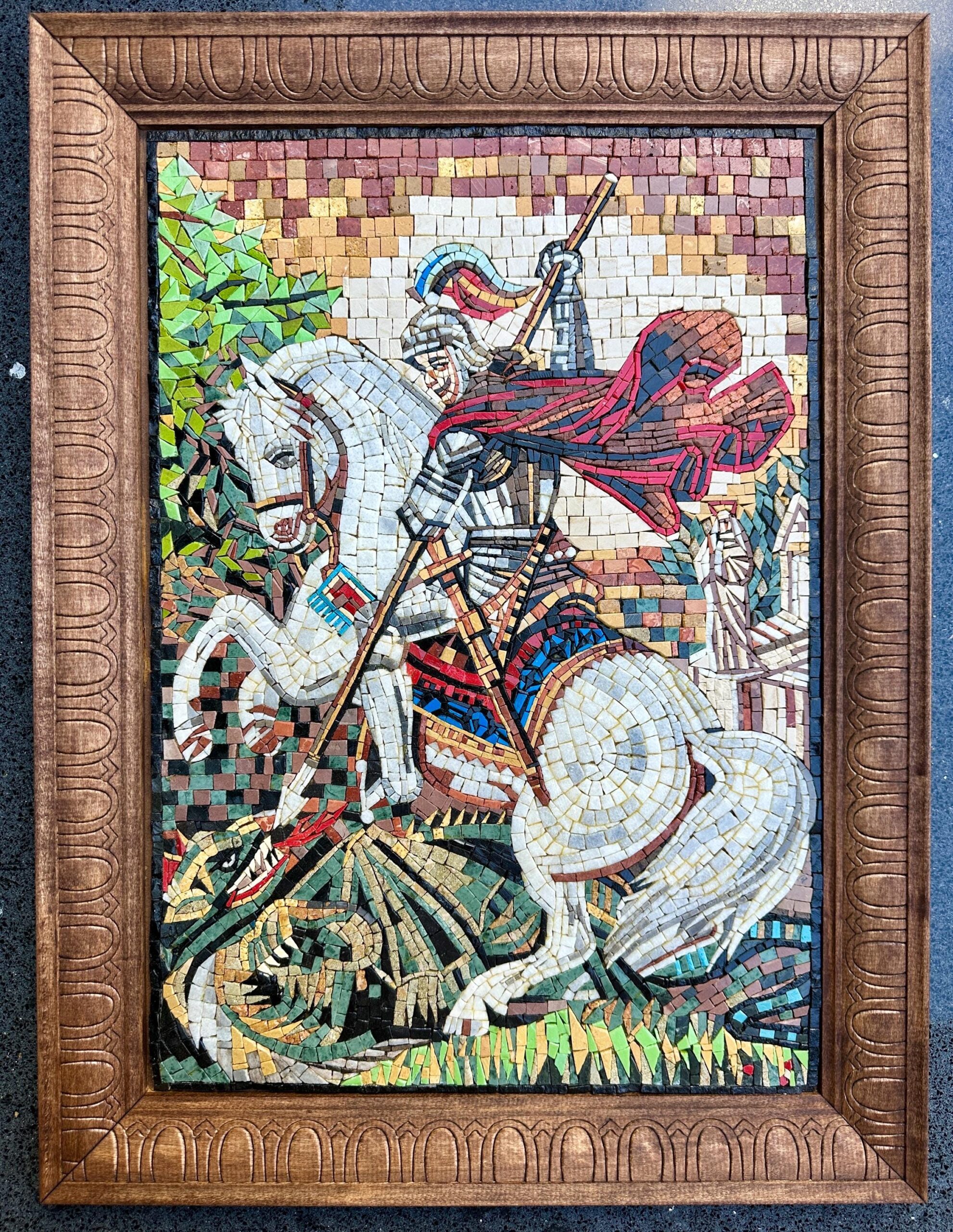 Celebrate the legendary tale of courage and faith with this handcrafted Saint George and the Dragon mosaic artwork. Carefully created from natural stone and marble tesserae, this mosaic captures the dramatic moment of Saint George slaying the dragon, symbolizing the triumph of good over evil.