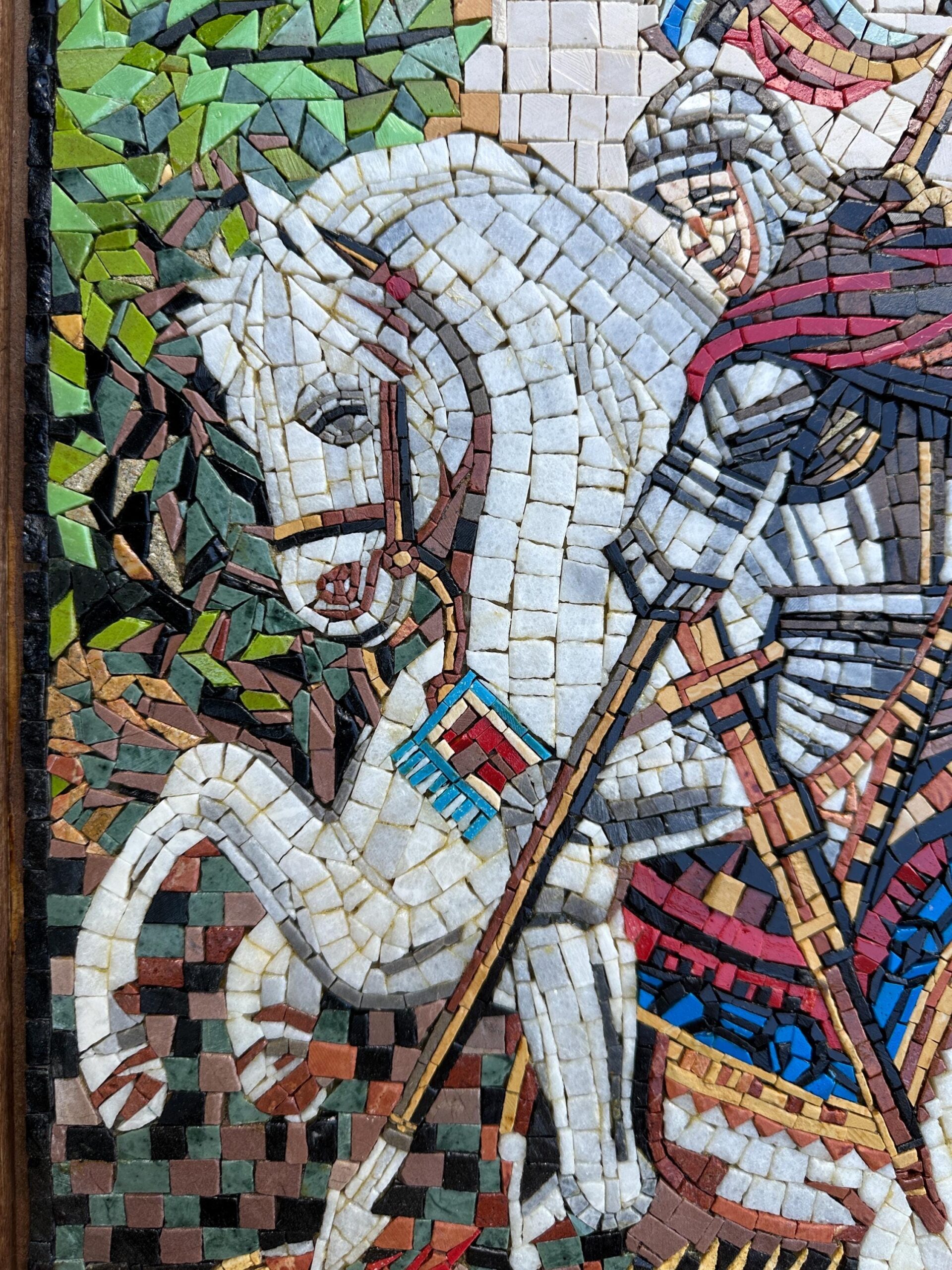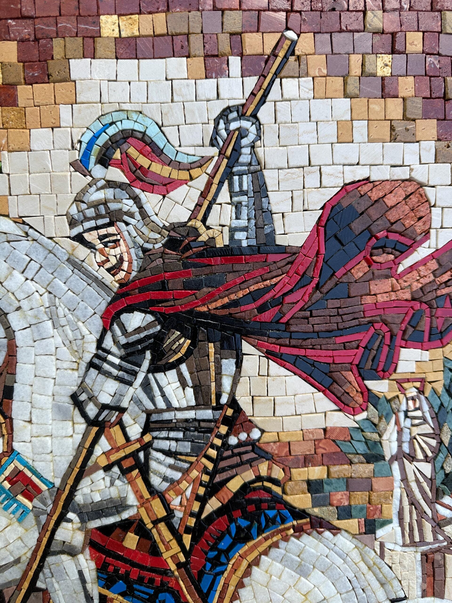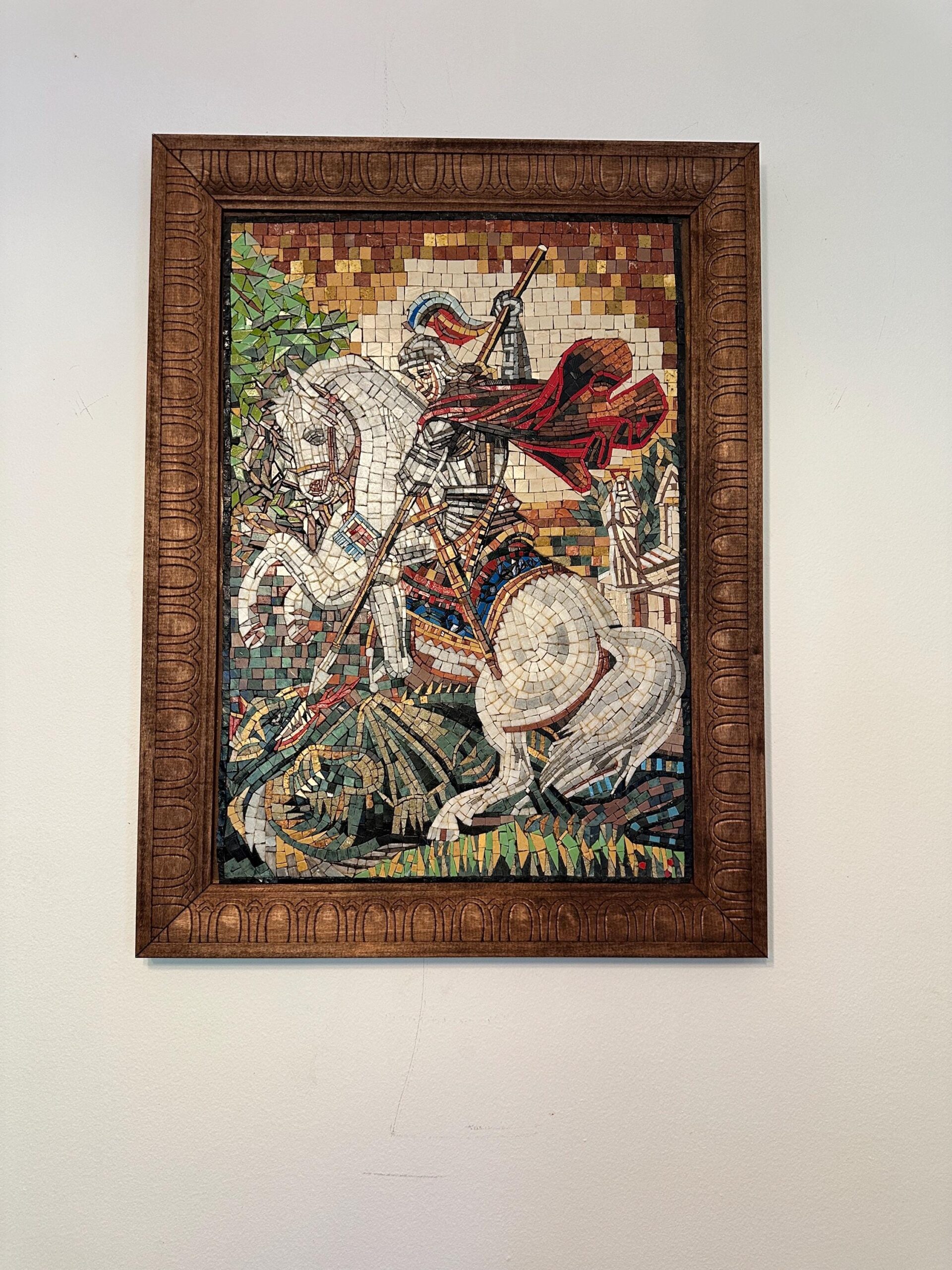 Celebrate the legendary tale of courage and faith with this handcrafted Saint George and the Dragon mosaic artwork. Carefully created from natural stone and marble tesserae, this mosaic captures the dramatic moment of Saint George slaying the dragon, symbolizing the triumph of good over evil.