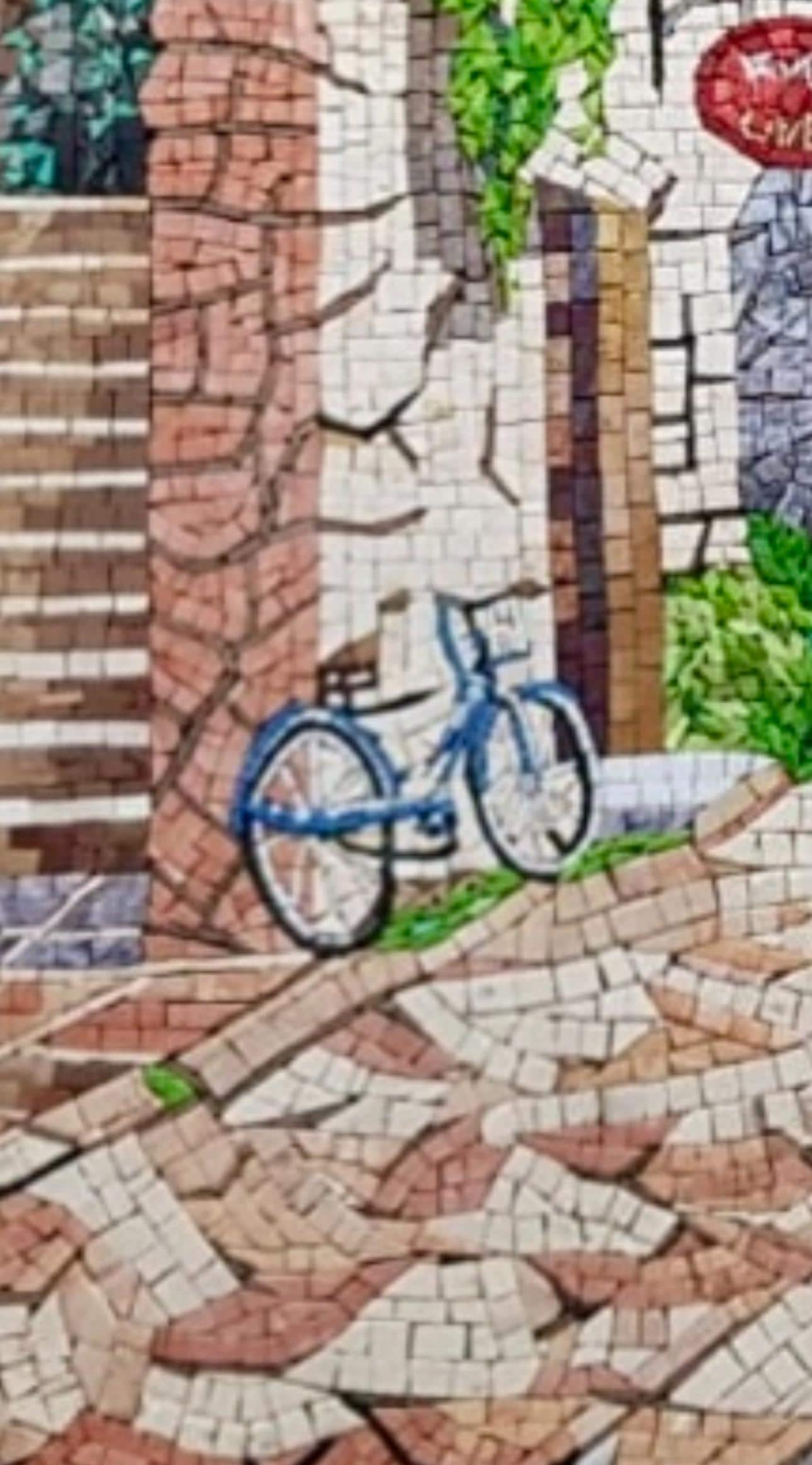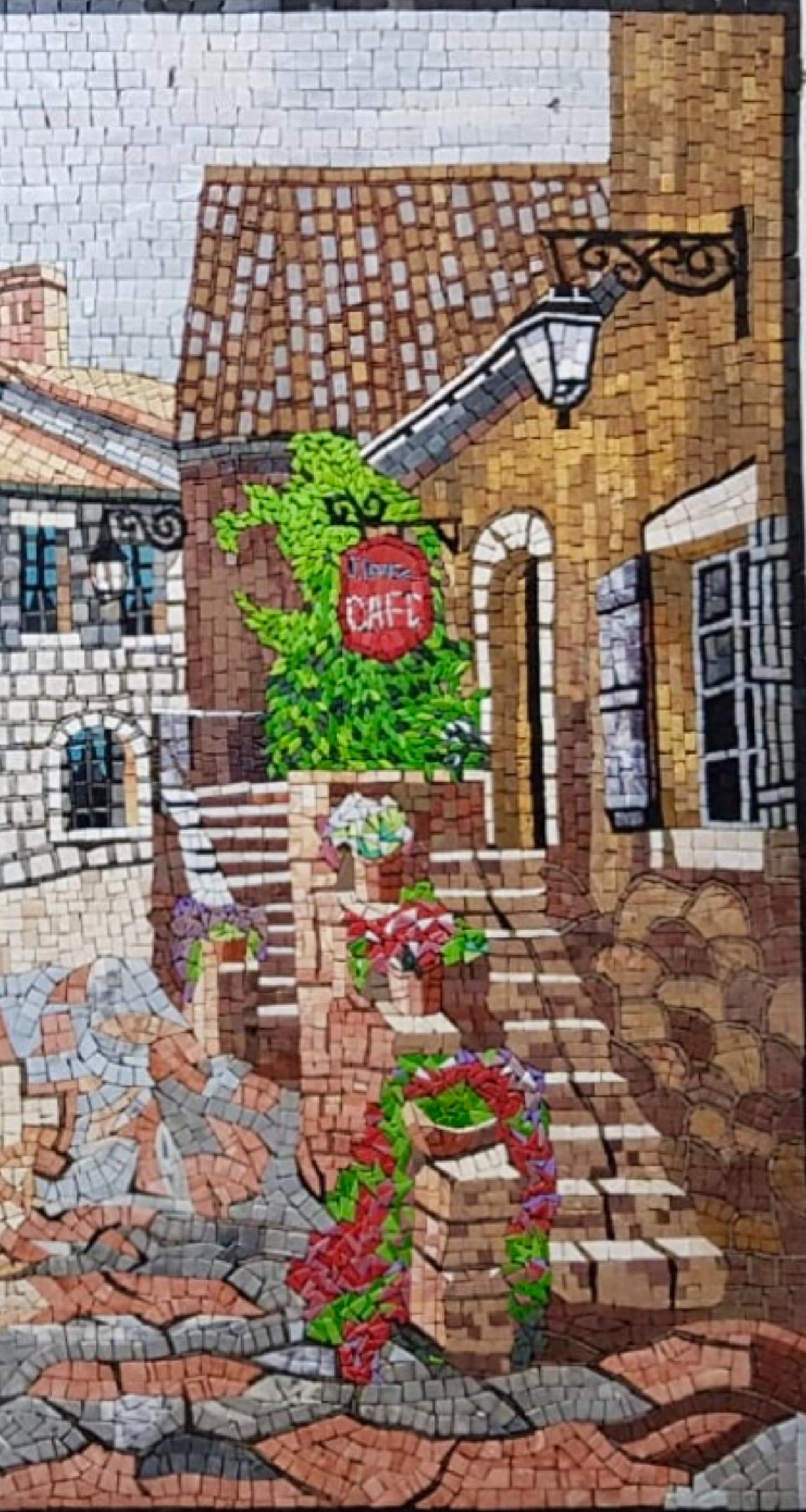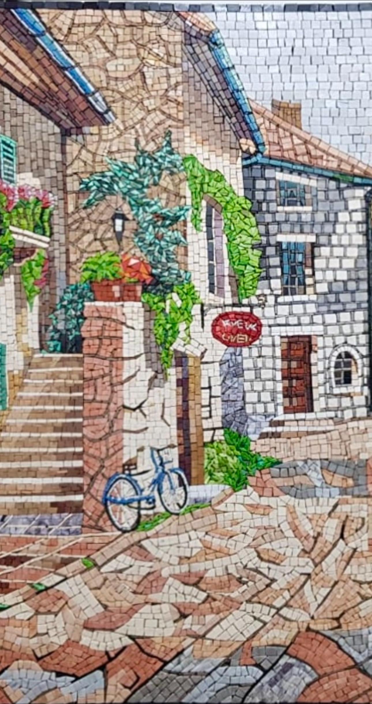 Step into timeless European charm with this handcrafted stone mosaic wall art. The piece depicts a peaceful Mediterranean village street with colorful flowers, rustic shutters, a classic bicycle, and a cozy café corner. Each tessera (stone piece) is carefully cut and placed by hand, creating a vibrant and detailed work of art.