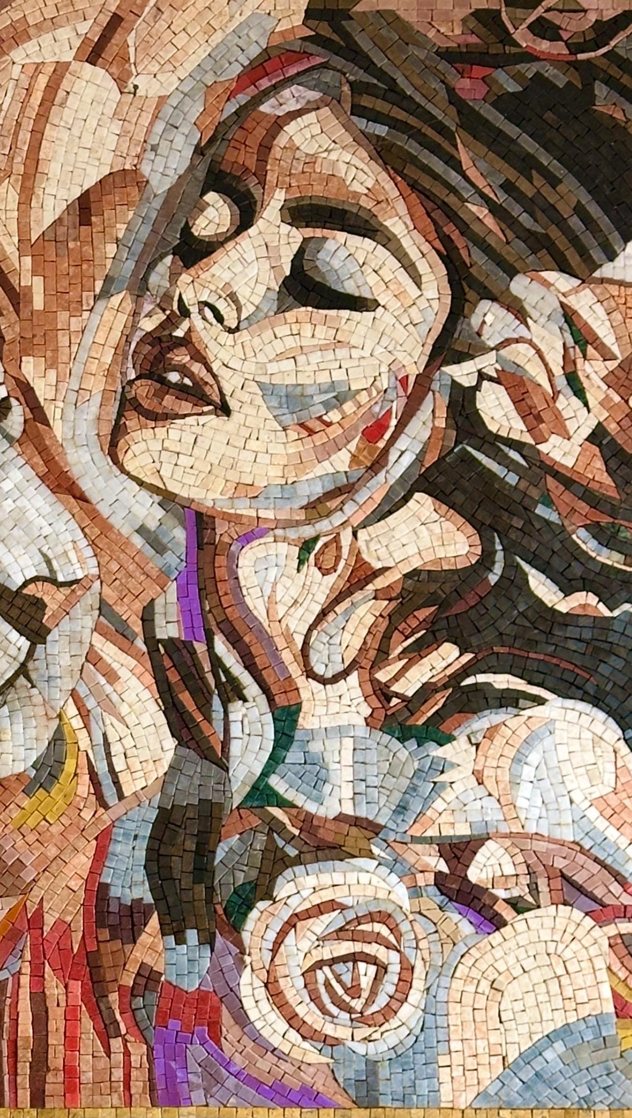 The mix of natural stone and marble creates vivid contrasts: the tiger’s bold stripes, the woman’s delicate features, and the soft floral accents all come together in a harmonious, modern composition. This mosaic is both dramatic and elegant, making it a breathtaking centerpiece for any space.
