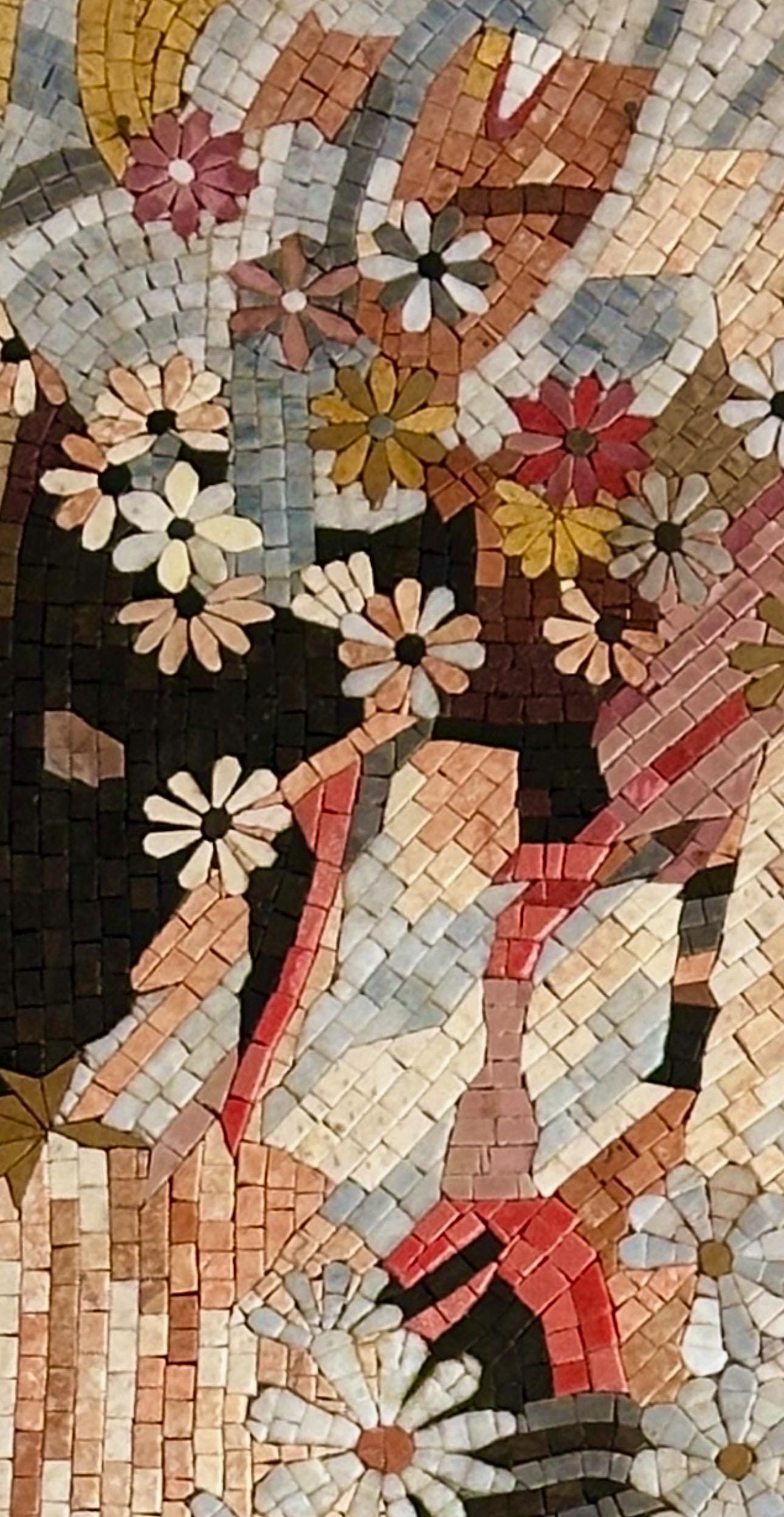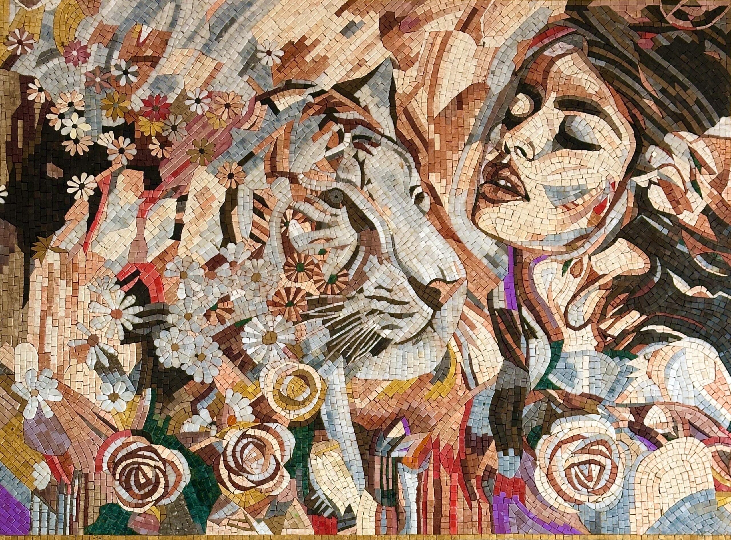 This stunning handmade stone mosaic captures the powerful bond between nature and humanity, featuring a majestic tiger alongside a graceful woman surrounded by blooming flowers. Each tessera is meticulously hand-cut and arranged, creating a flowing design that blends strength, beauty, and serenity.
