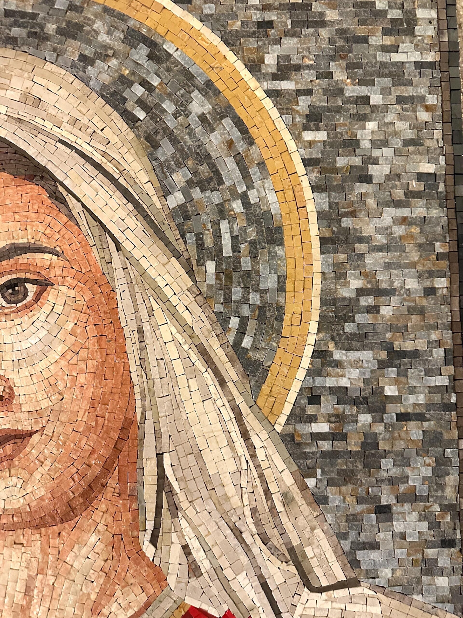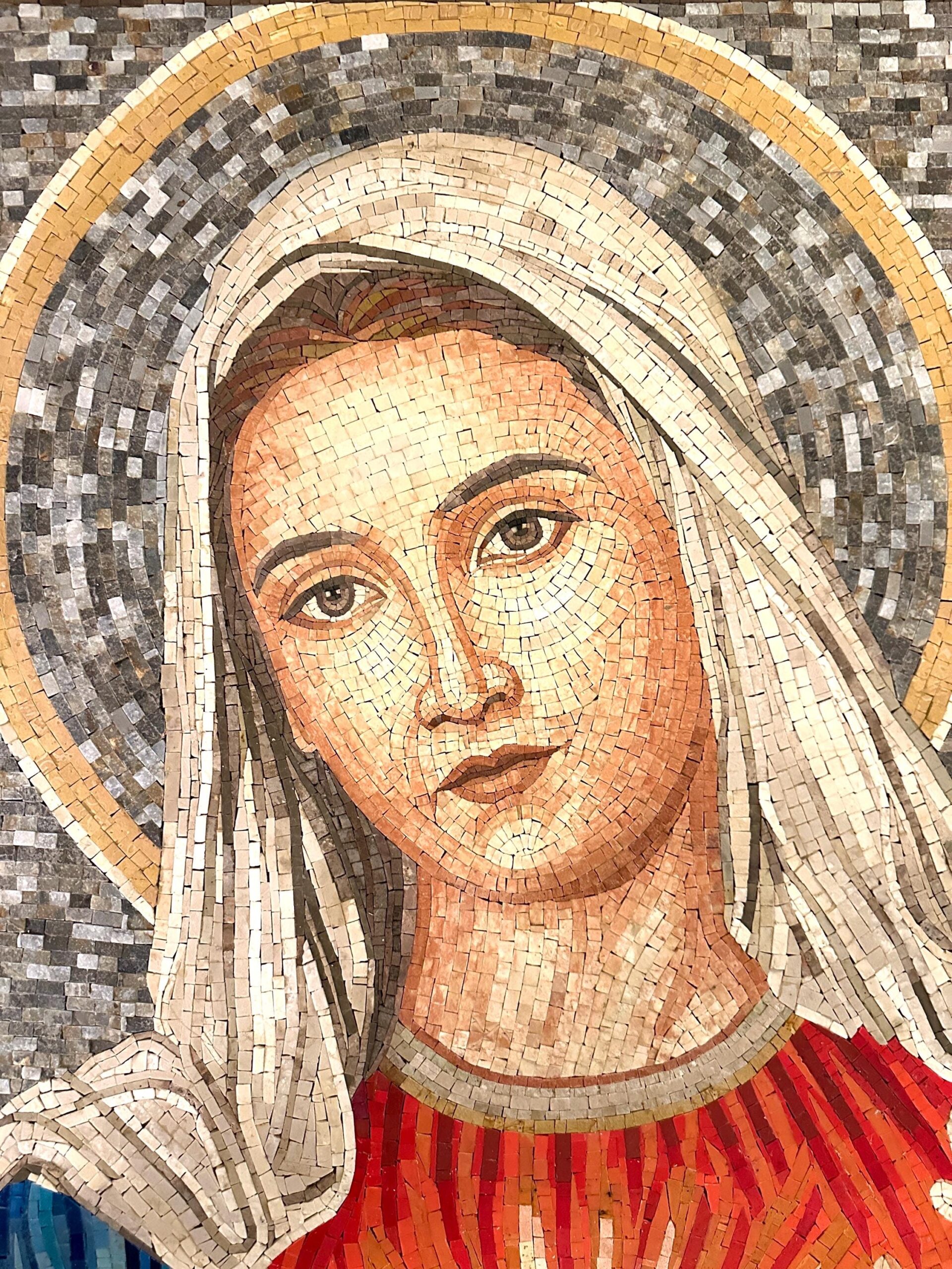 This detailed mosaic icon captures the serene expression of the Virgin Mary, illuminated by a radiant golden halo and the glowing Sacred Heart symbolizing love, compassion, and divine grace. Each stone is carefully shaped and placed by hand, creating depth, texture, and a luminous effect that only authentic mosaic art can achieve.