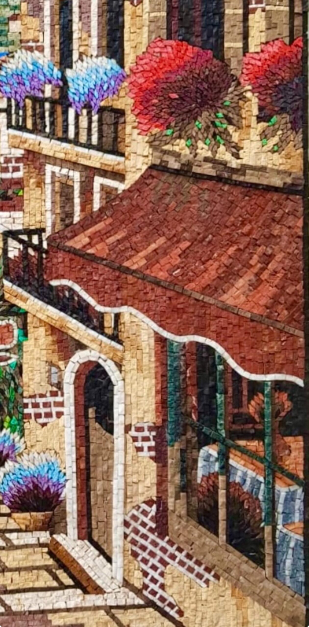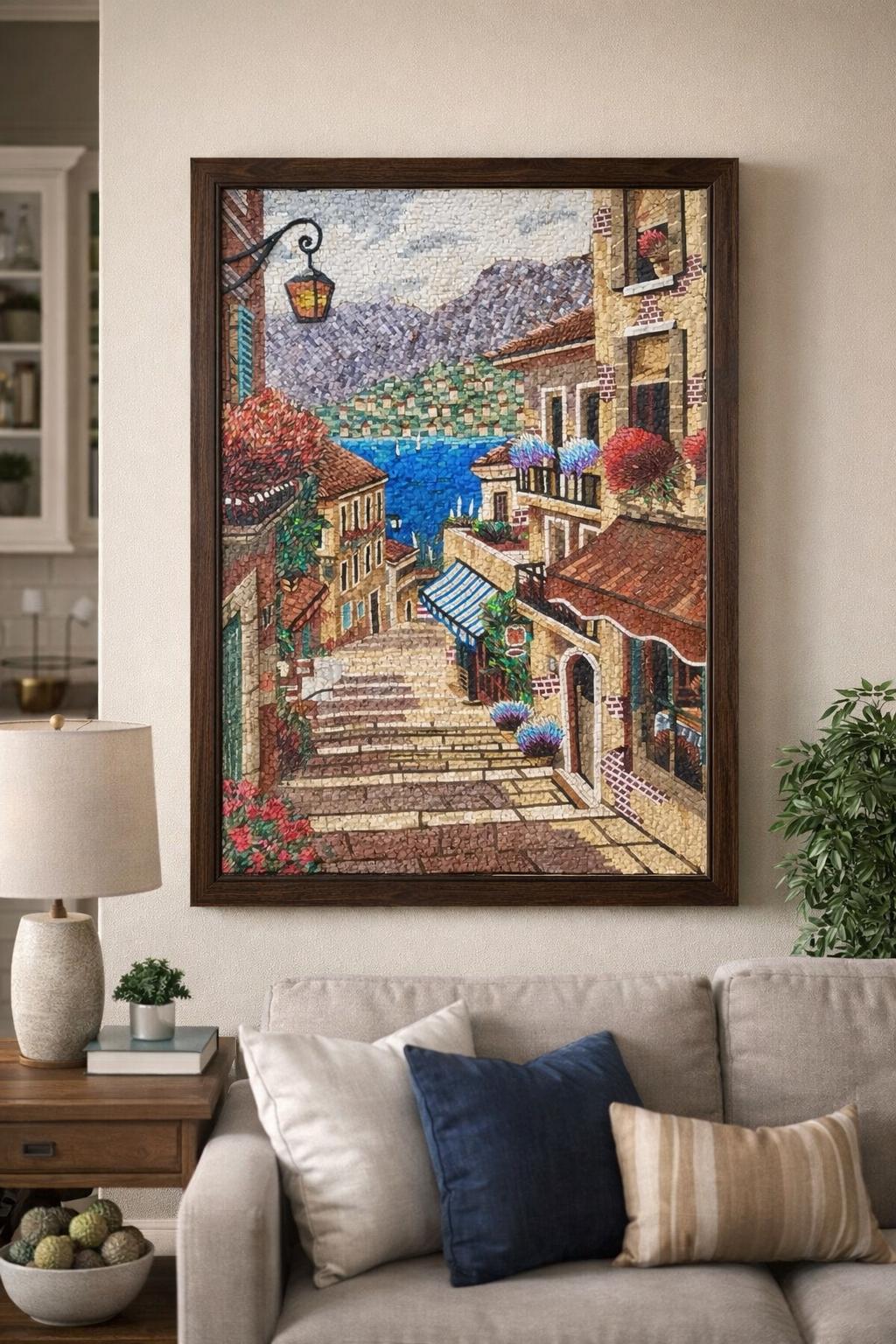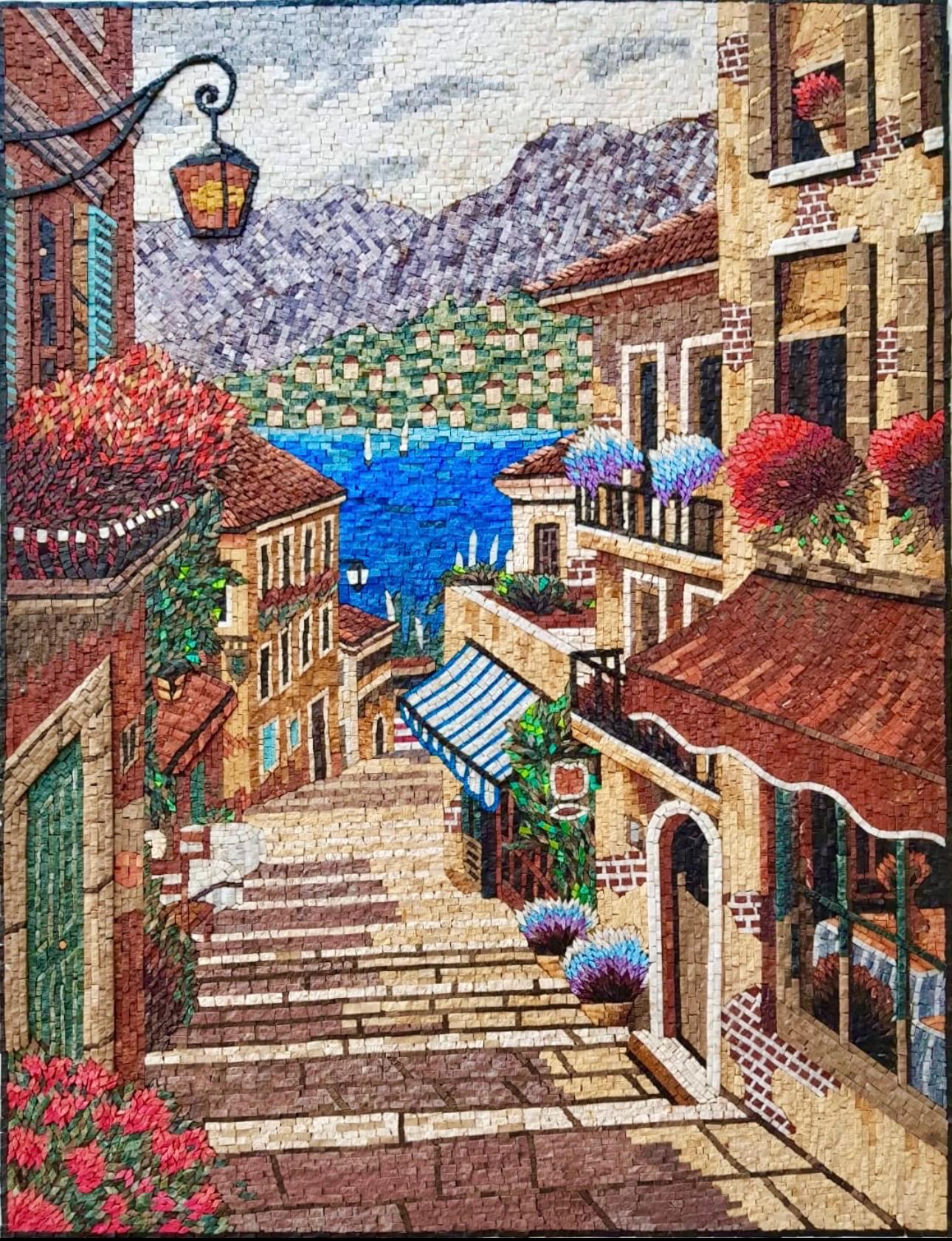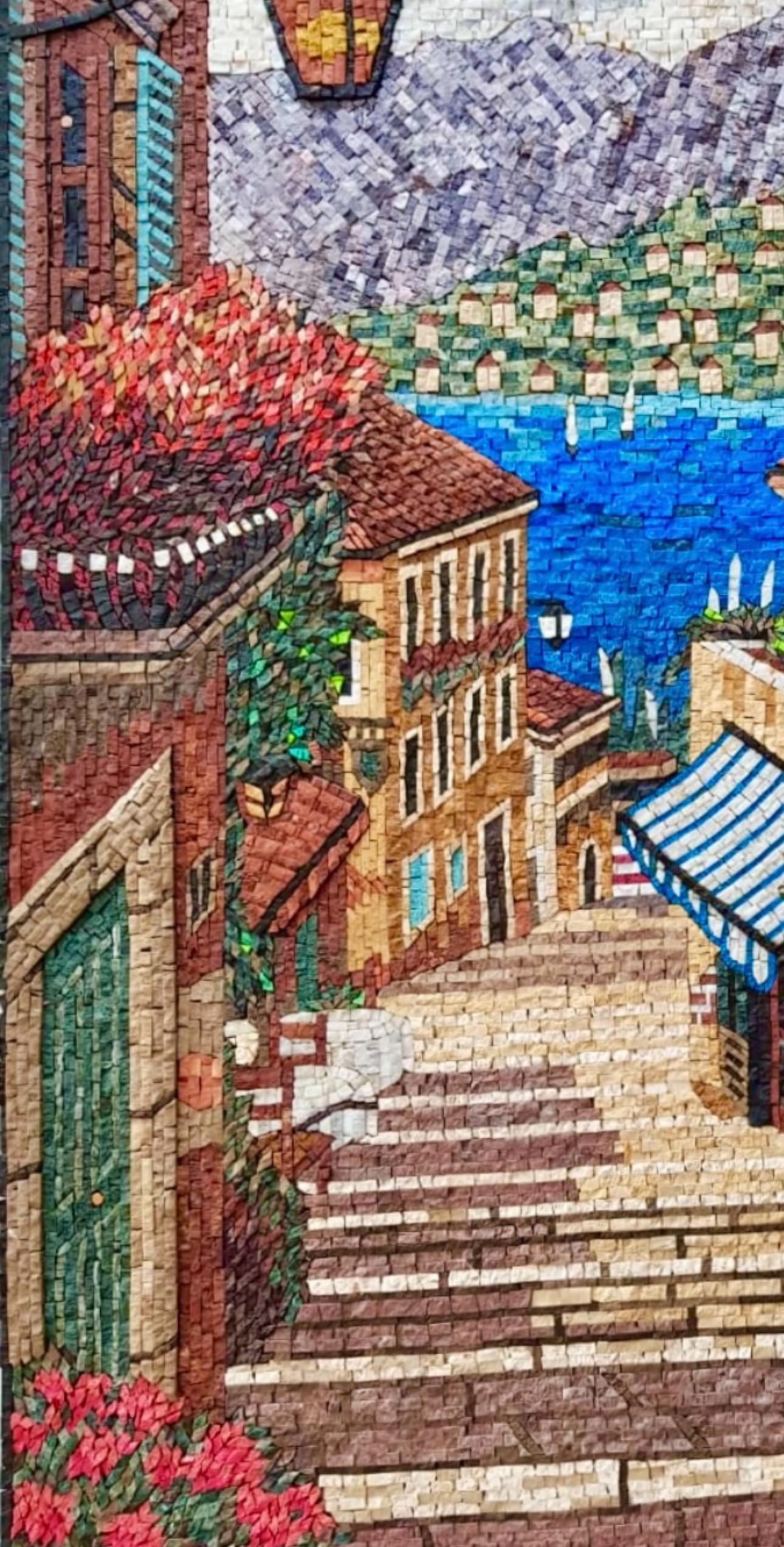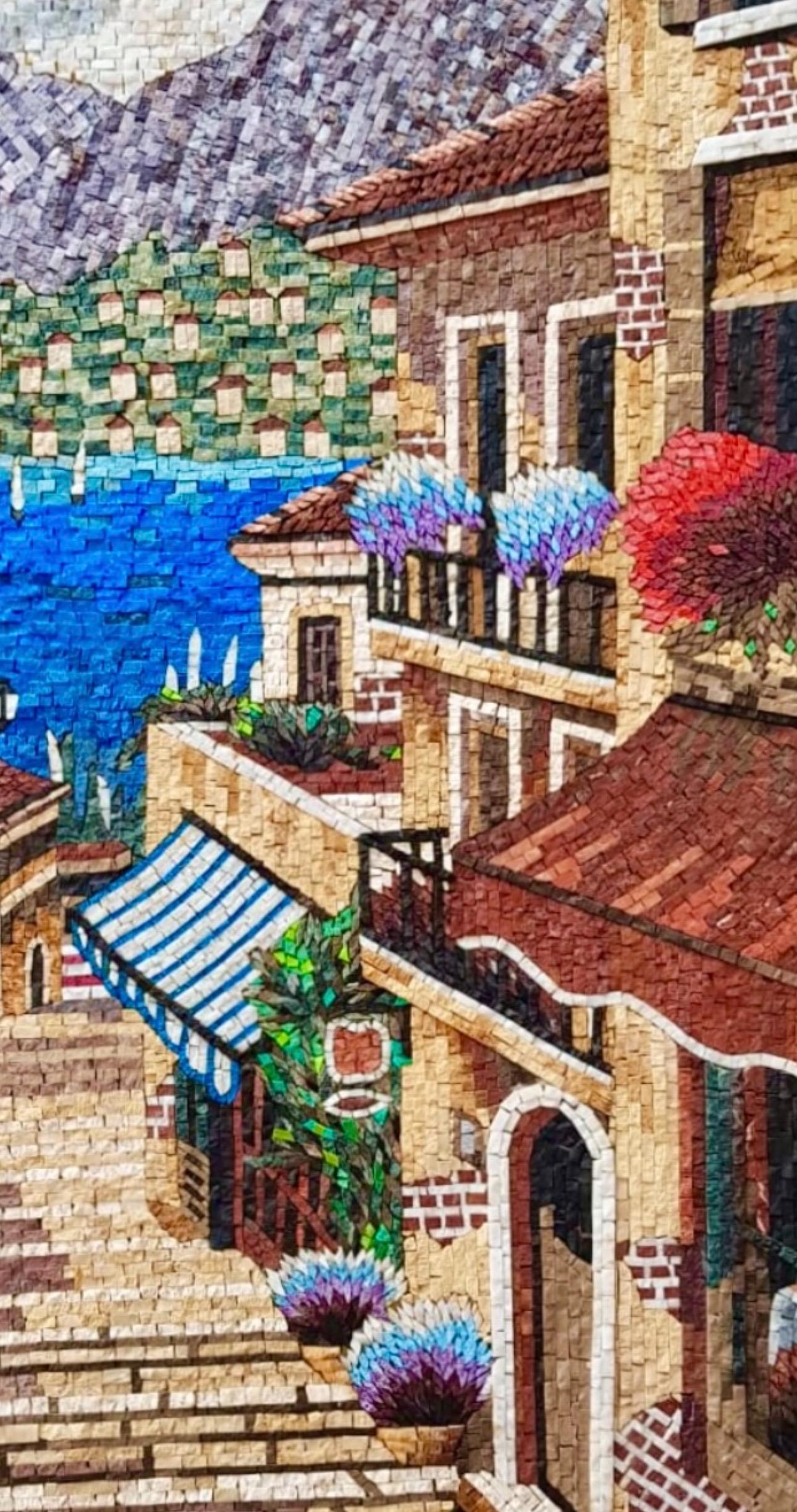 Each tessera is hand-cut from natural marble and stone, placed one by one to create depth, texture, and vibrant detail. From the terracotta rooftops and flower-filled balconies to the blue-striped awning and glowing lantern, every element is crafted with precision to give the scene life and movement.