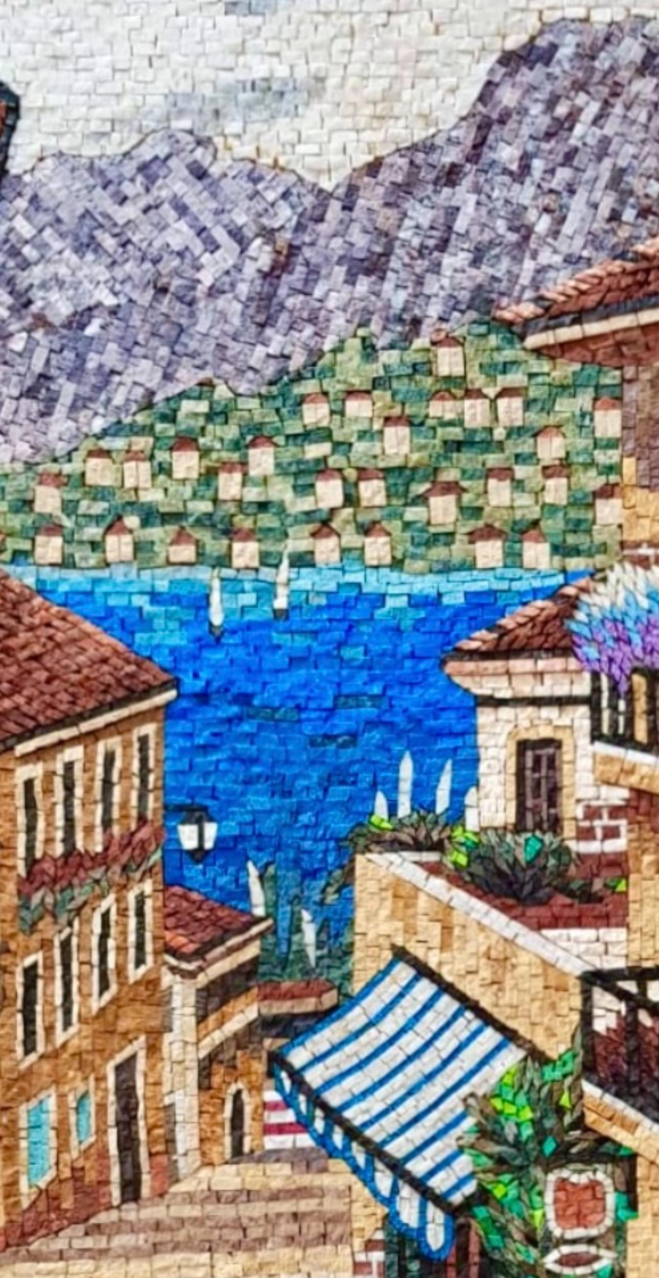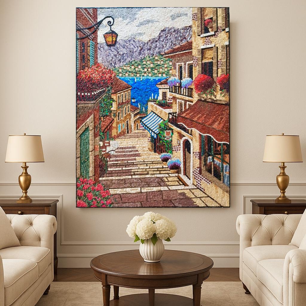 This beautiful handcrafted stone mosaic captures the charm of a romantic Italian hillside village, overlooking a bright blue lake surrounded by mountains. Inspired by the famous streets of Bellagio and Lake Como, this artwork brings the warmth, color, and atmosphere of the Mediterranean into your home.