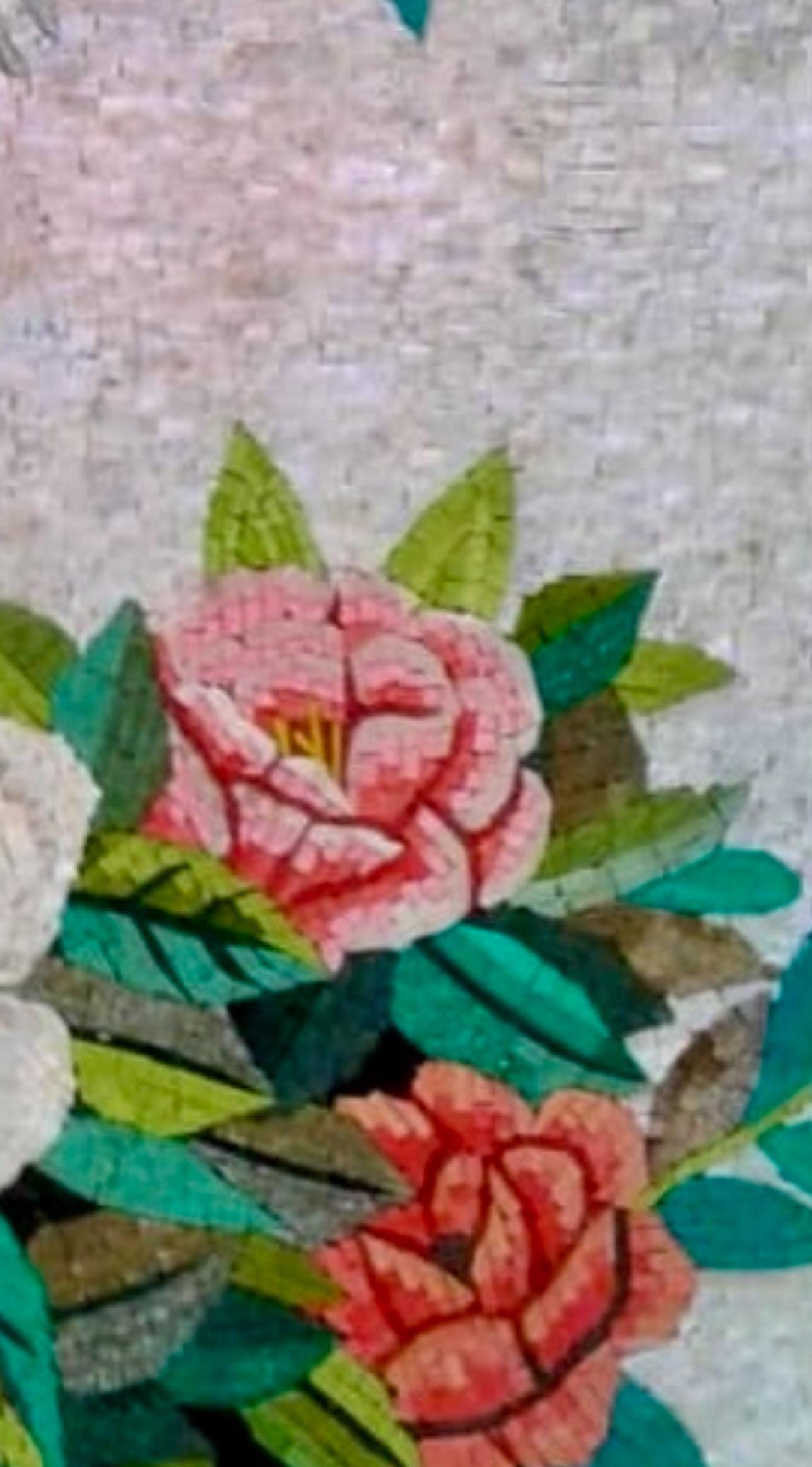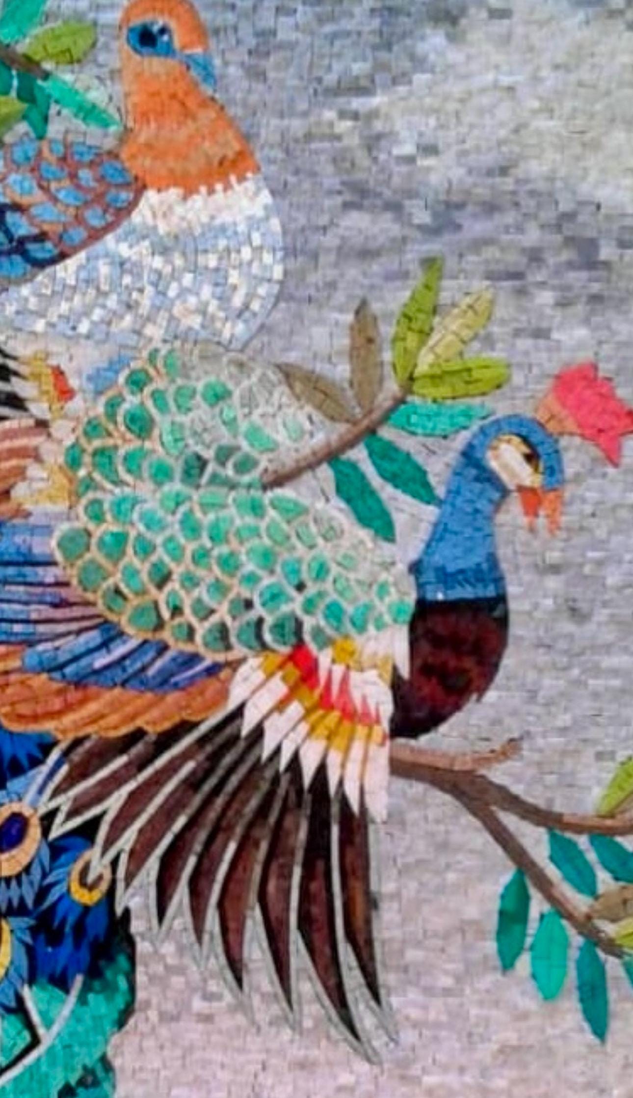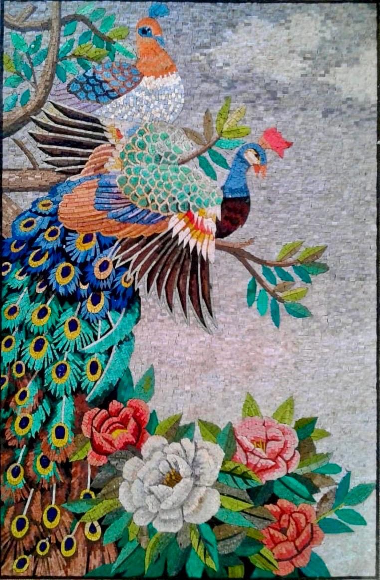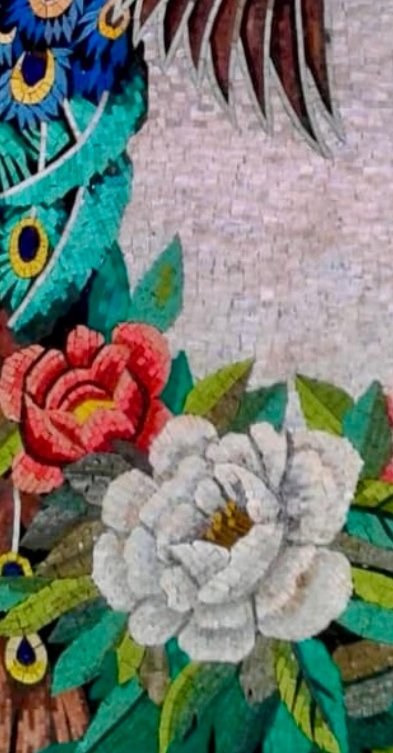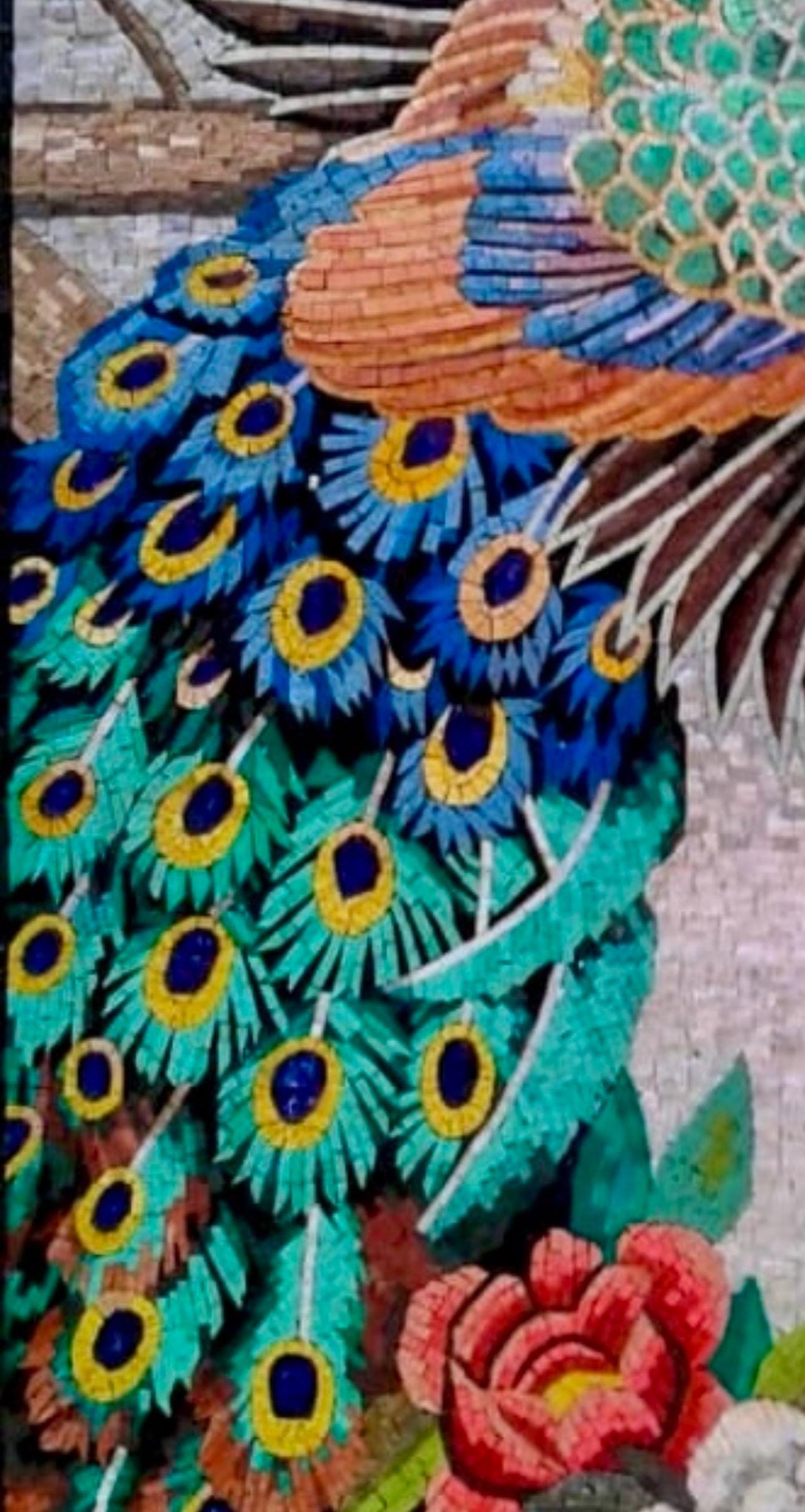 Bring timeless elegance and vibrant color into your space with this exquisite handmade stone mosaic featuring two majestic peacocks perched among blooming peonies. Each tiny tessera is carefully cut and placed by hand, creating a captivating display of texture, depth, and artistry. The vivid blues, greens, and golds of the peacocks’ plumage contrast beautifully with the soft pinks, reds, and whites of the flowers, making this piece a true focal point in any room.