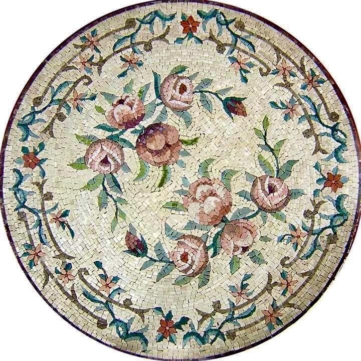 This beautiful handcrafted round stone mosaic features a delicate floral design with soft blush pink roses, surrounded by flowing green leaves and accented with small orange and red blossoms.