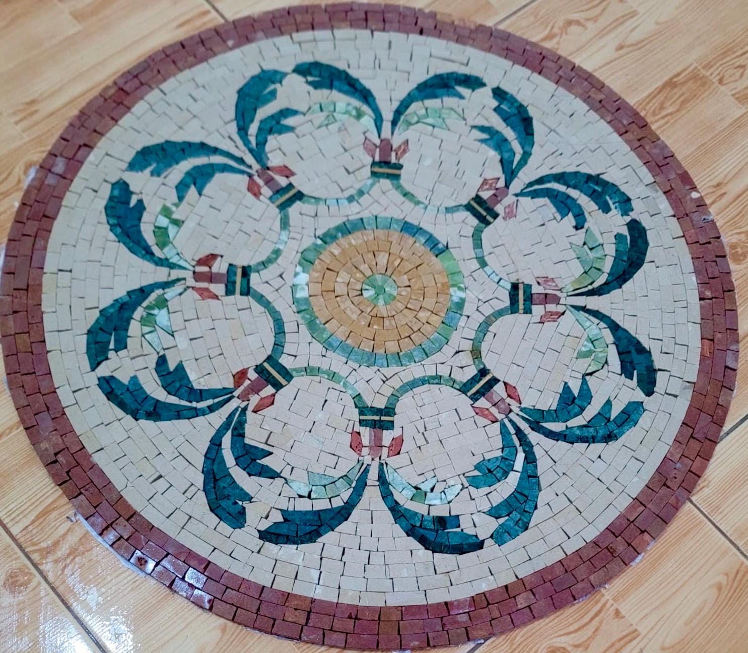 Bring timeless elegance to your space with this handmade round floral medallion mosaic, crafted from natural marble and stone tesserae. Featuring an intricate flower-inspired design framed with a classic border, this mosaic is perfect as a floor medallion, wall accent, or tabletop inlay.