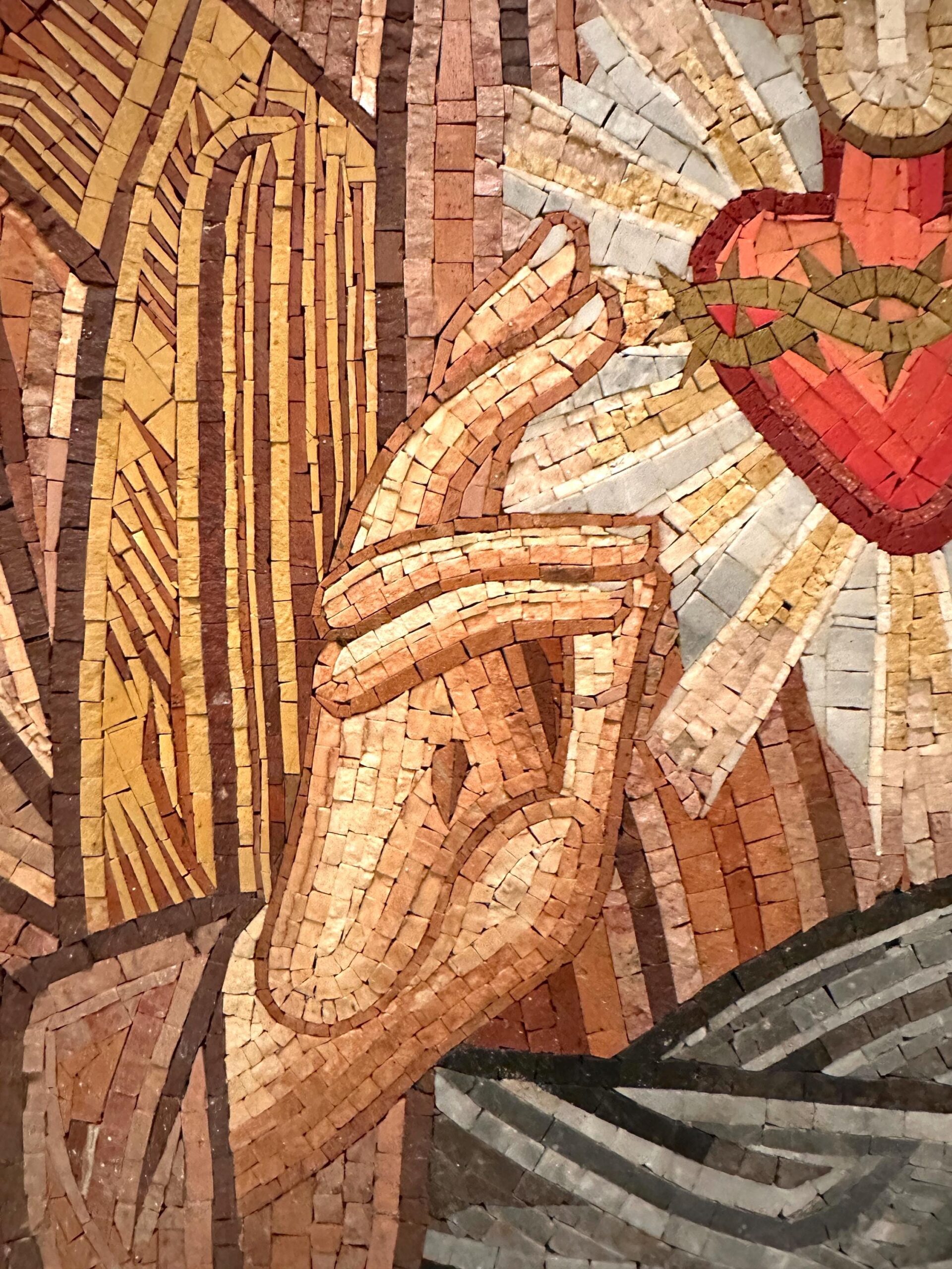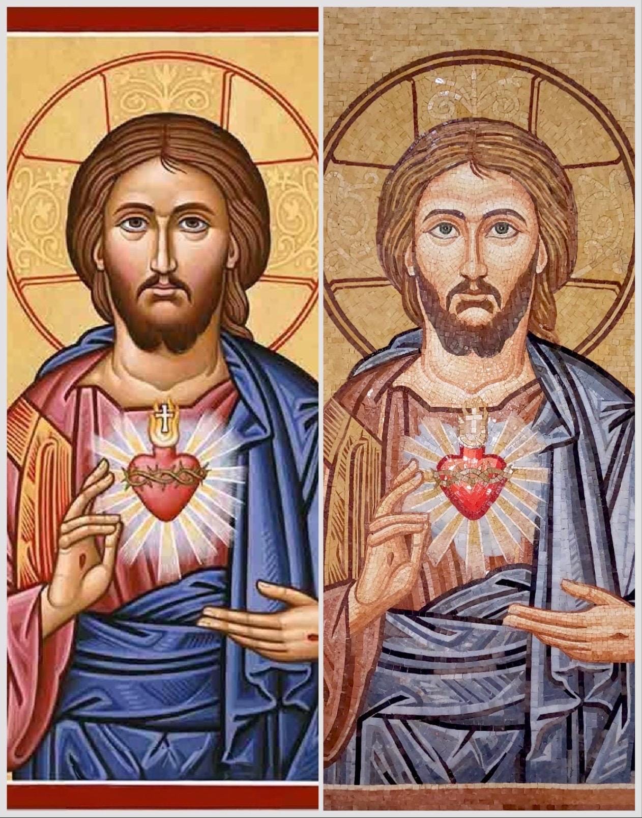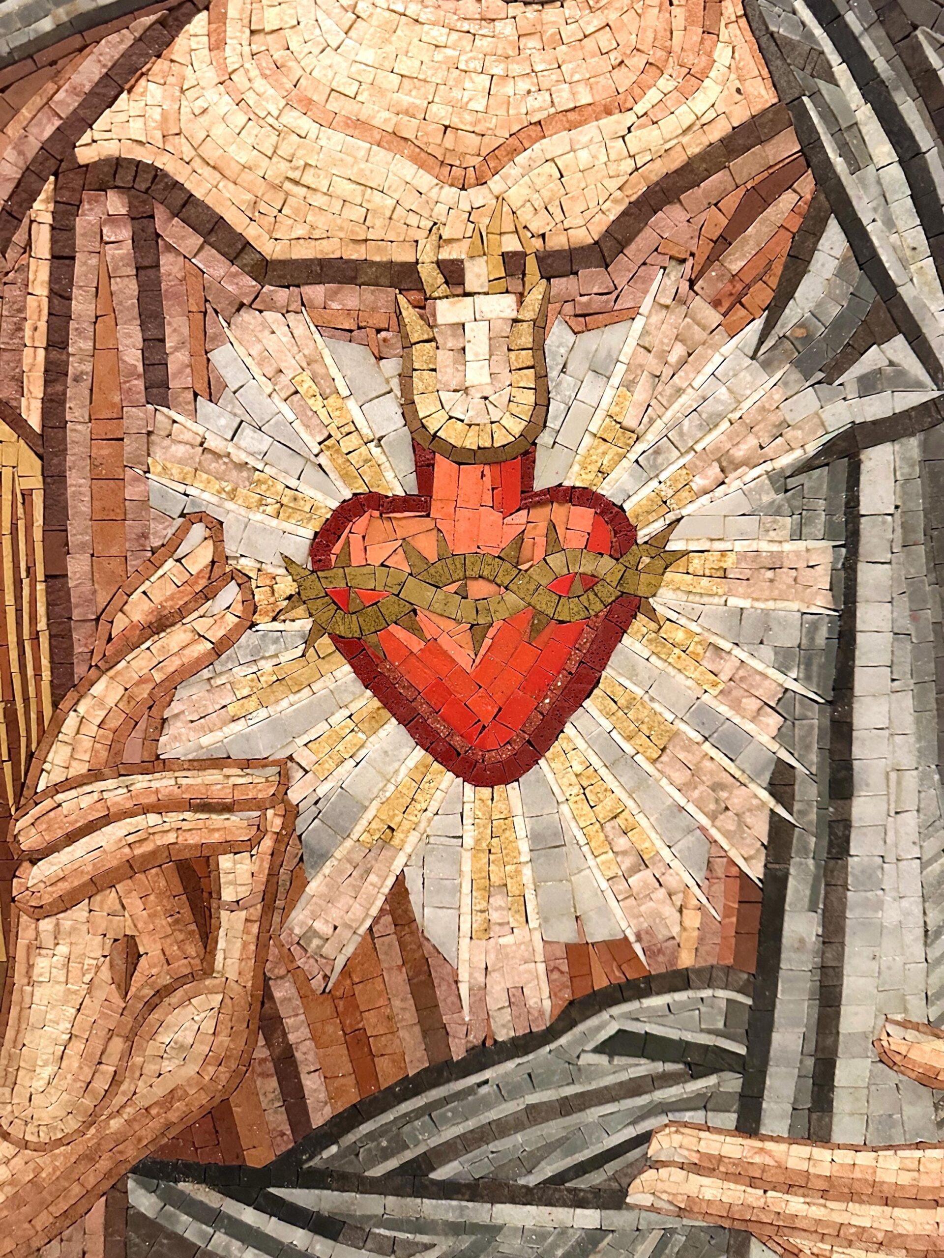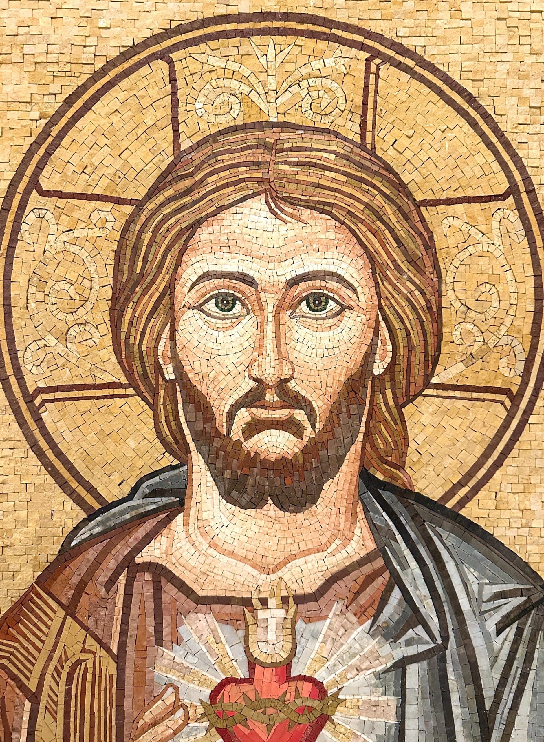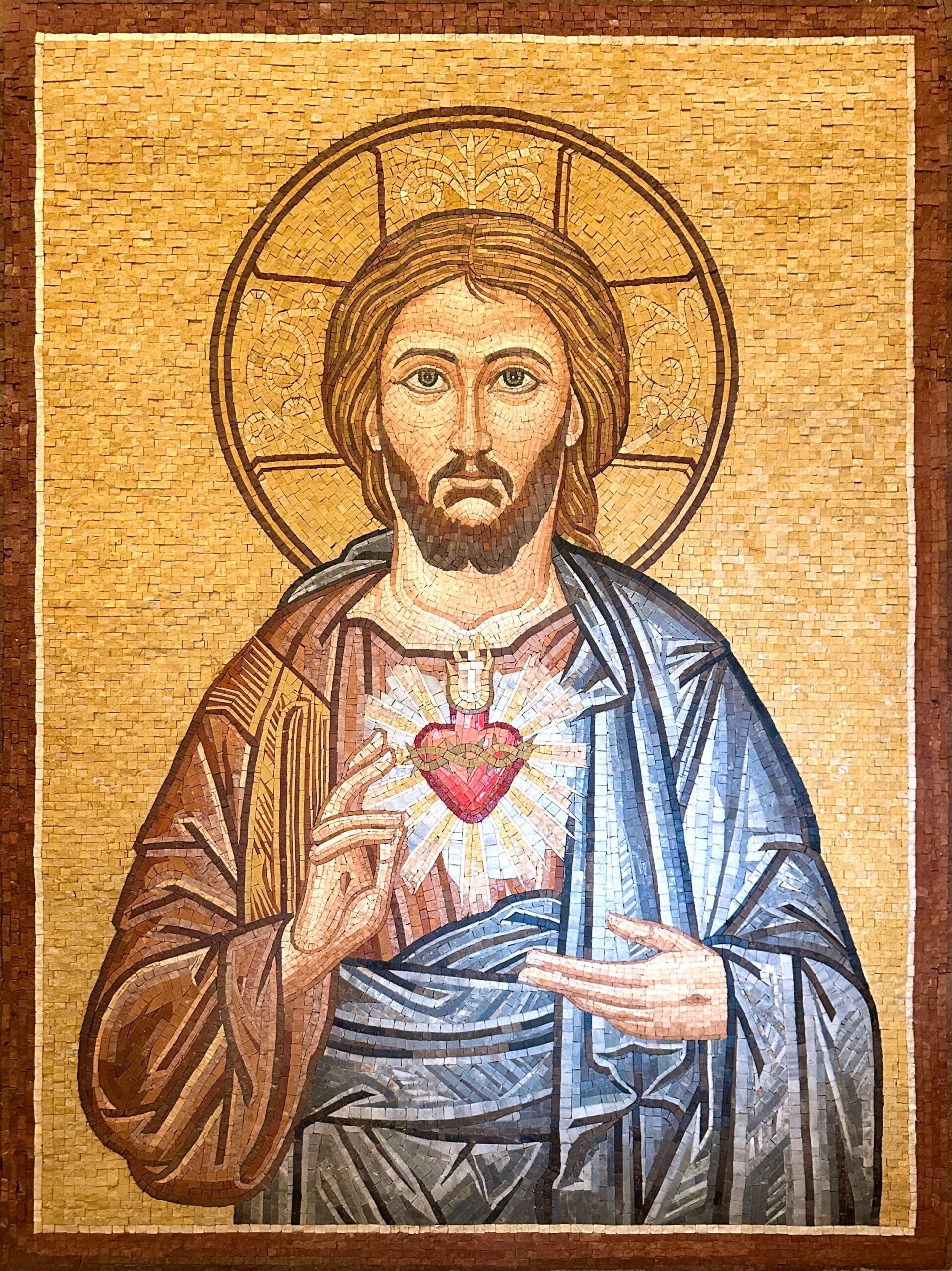 This Sacred Heart of Jesus mosaic is a handcrafted work of devotional art, inspired by traditional Christian iconography and made using the ancient mosaic technique. Each piece is meticulously composed from natural stone and marble tesserae, creating rich texture, depth, and timeless beauty.