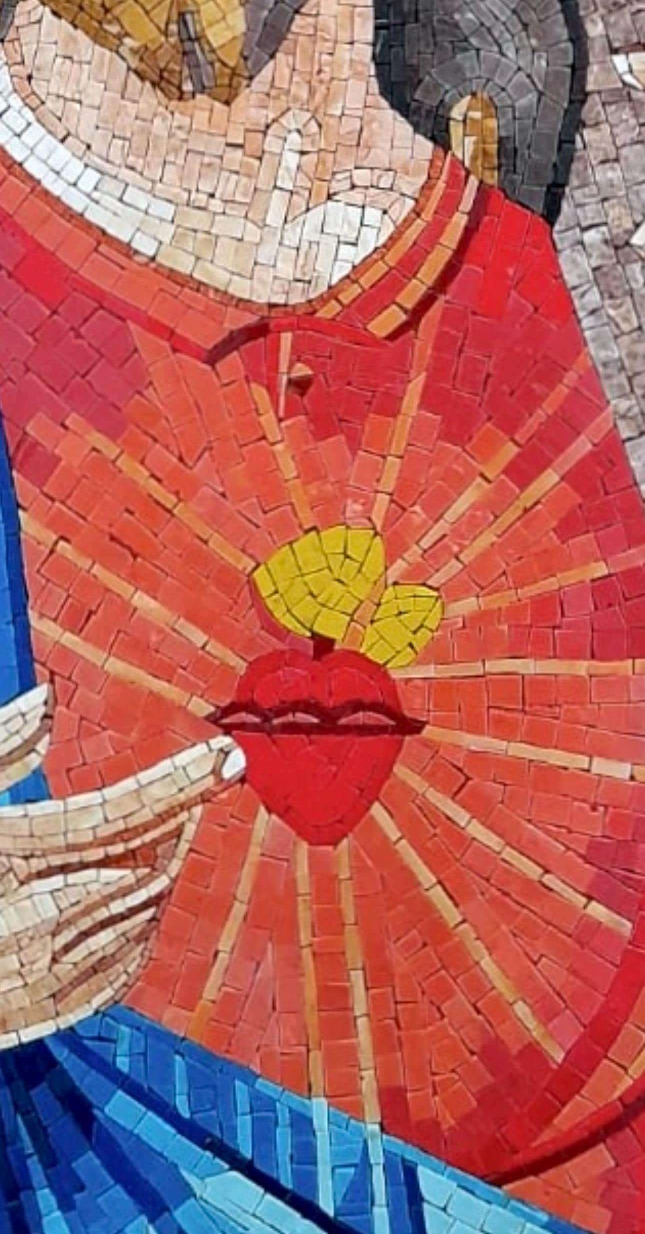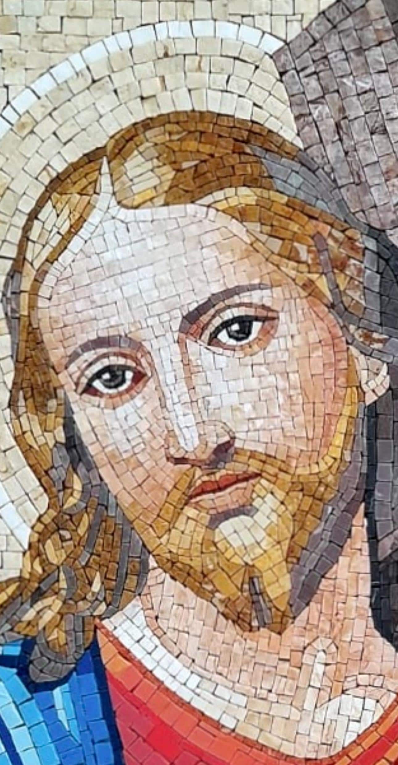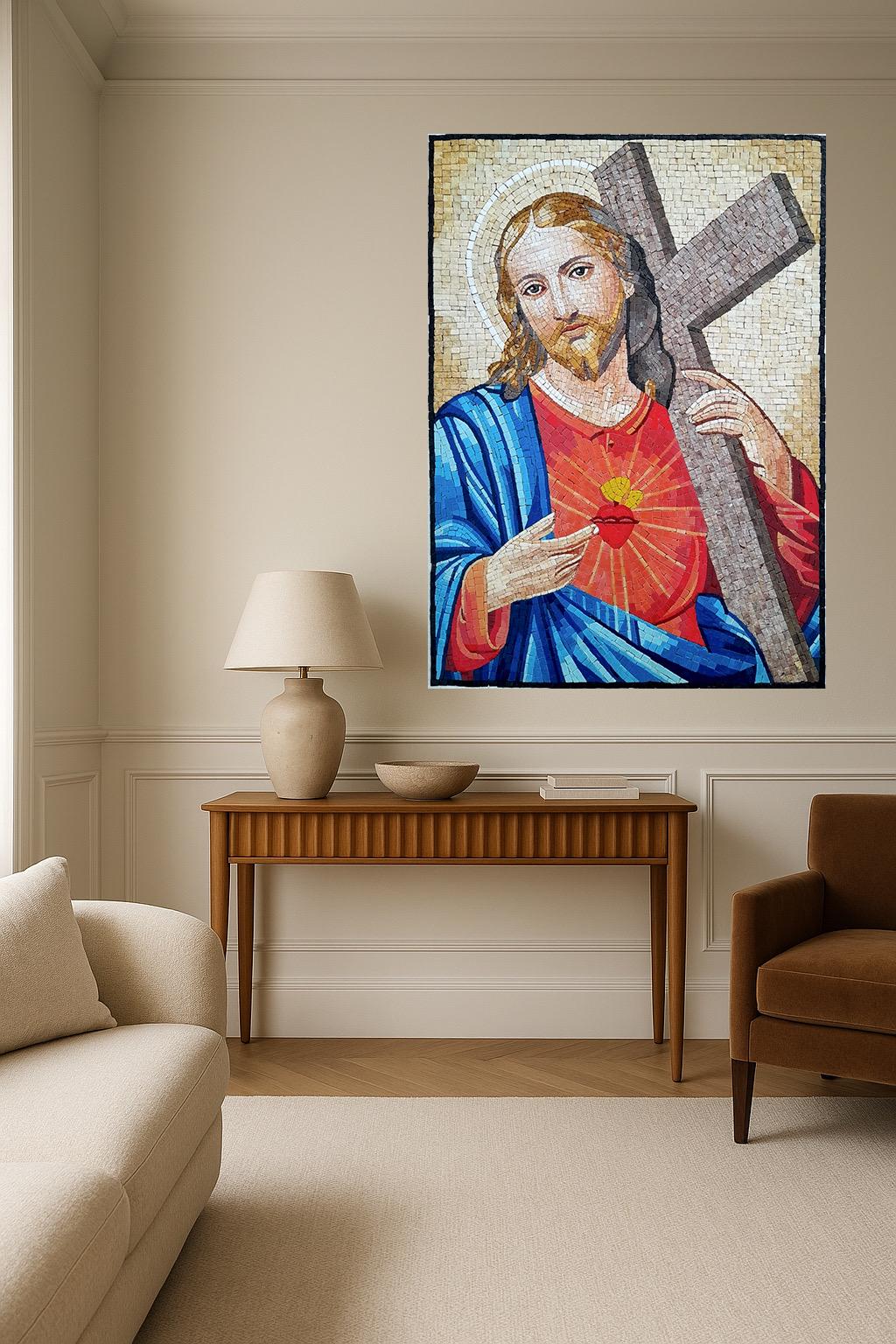 This striking Sacred Heart of Jesus mosaic is handcrafted from natural marble and stone tesserae, showcasing the divine compassion and strength of Christ. Every small piece is meticulously hand-cut and arranged to form an inspiring representation filled with color, light, and sacred symbolism.