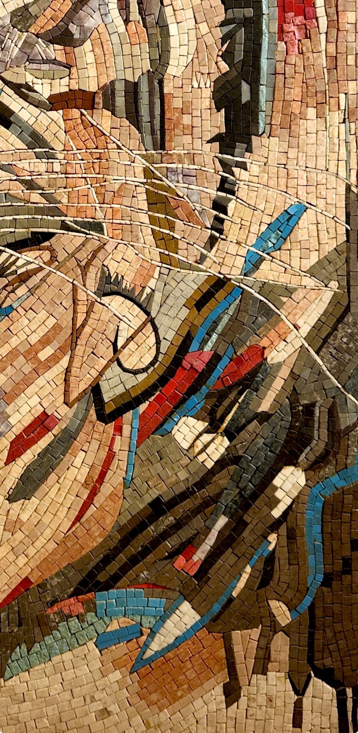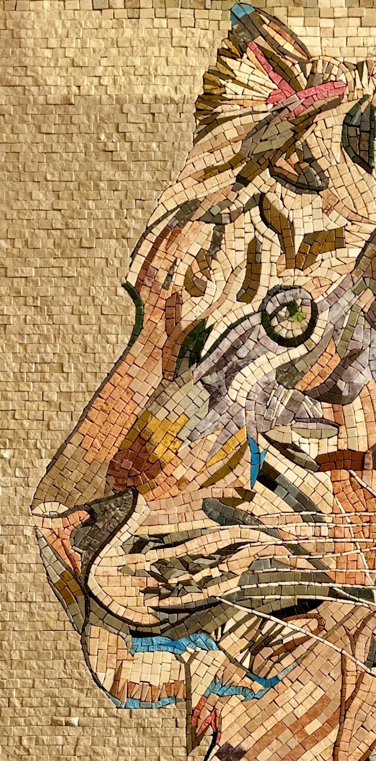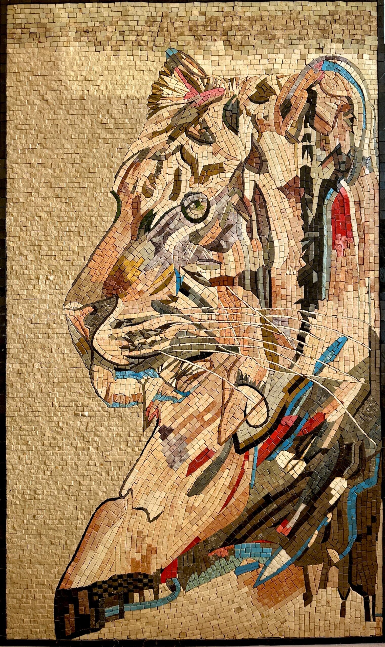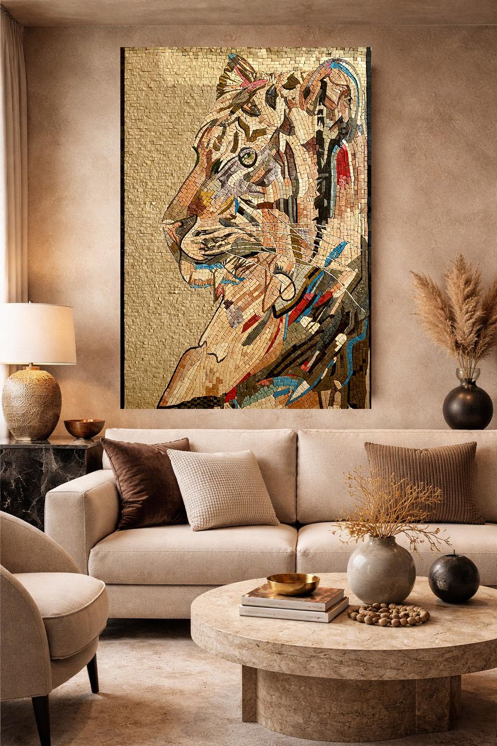 Each tessera is individually hand-cut and placed using natural marble and stone, forming a dynamic, painterly composition. Warm neutral tones are accented with subtle blues and rich earthy hues, giving the tiger depth, motion, and an expressive gaze. The textured stone background enhances contrast while keeping the tiger as the focal point.