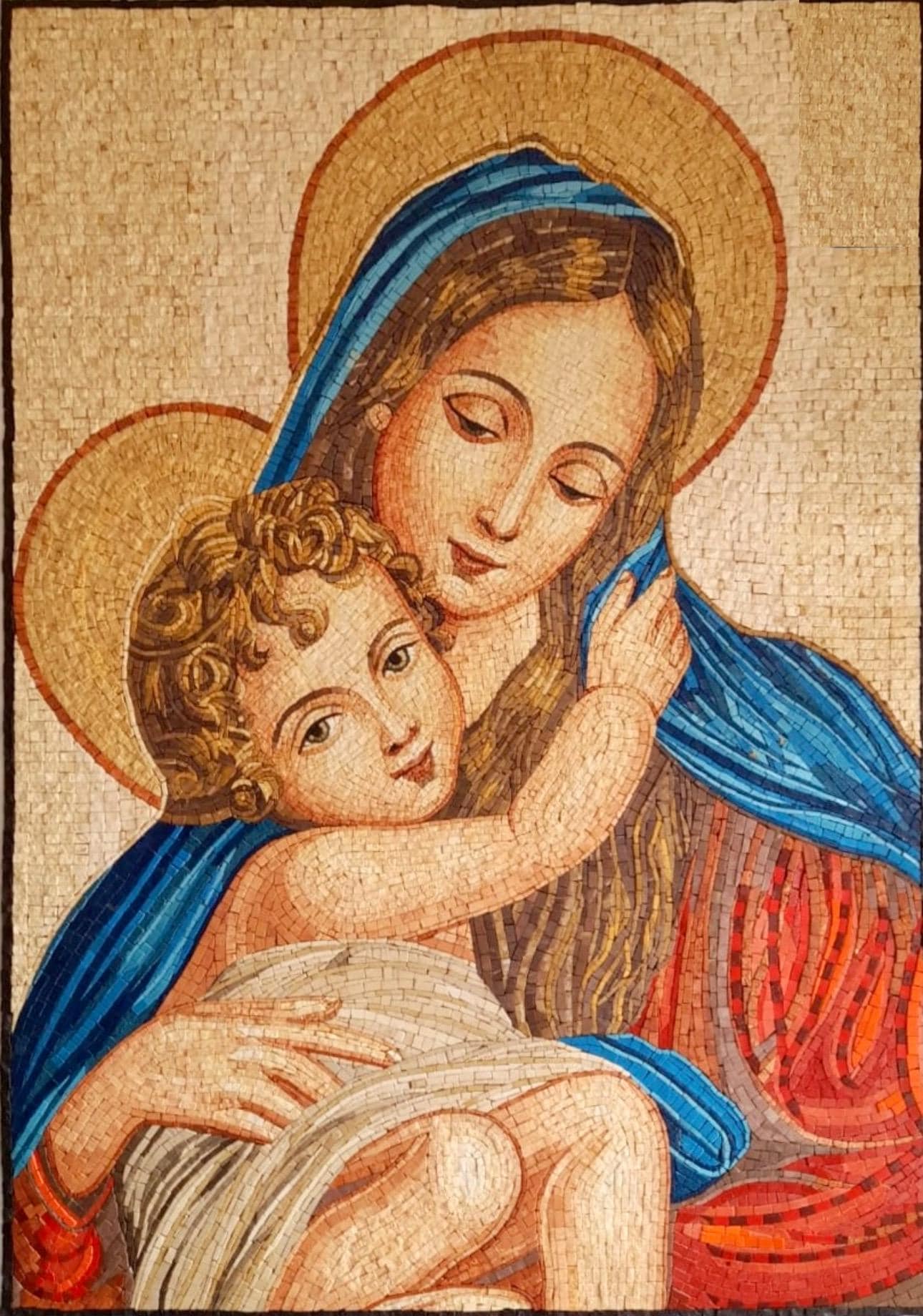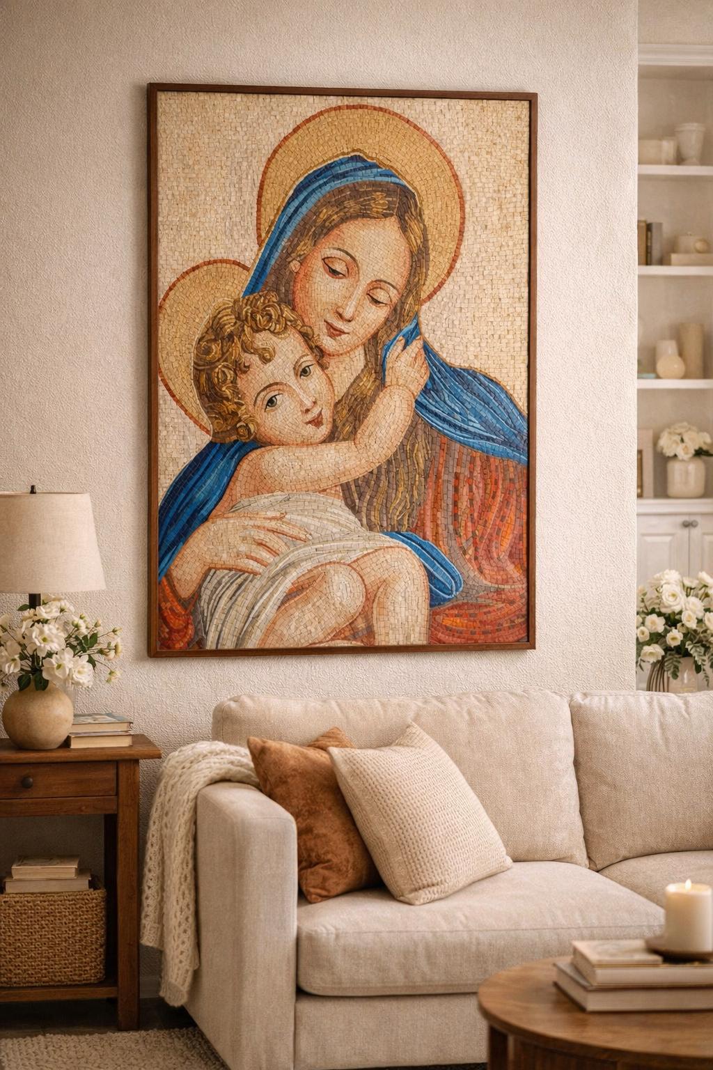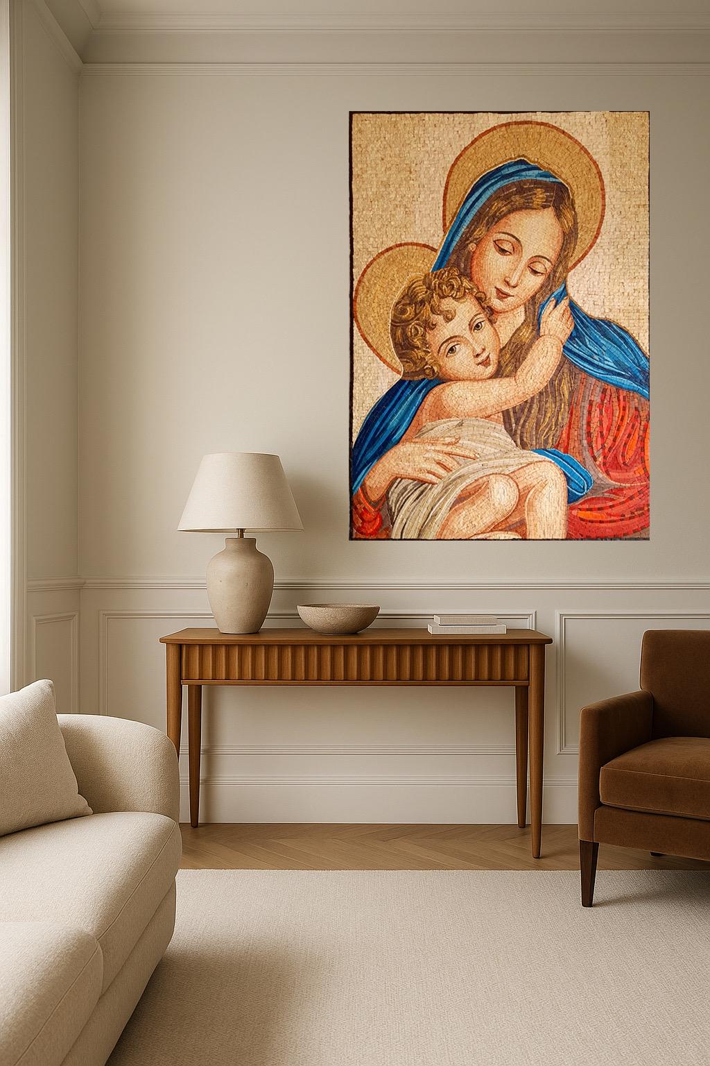 This exquisite handmade mosaic of the Virgin Mary and Child is crafted from natural marble and stone tesserae, skillfully arranged to capture timeless warmth and devotion. Each piece is individually cut and placed by hand, creating depth, texture, and radiant color harmony reminiscent of Byzantine and Renaissance sacred art.