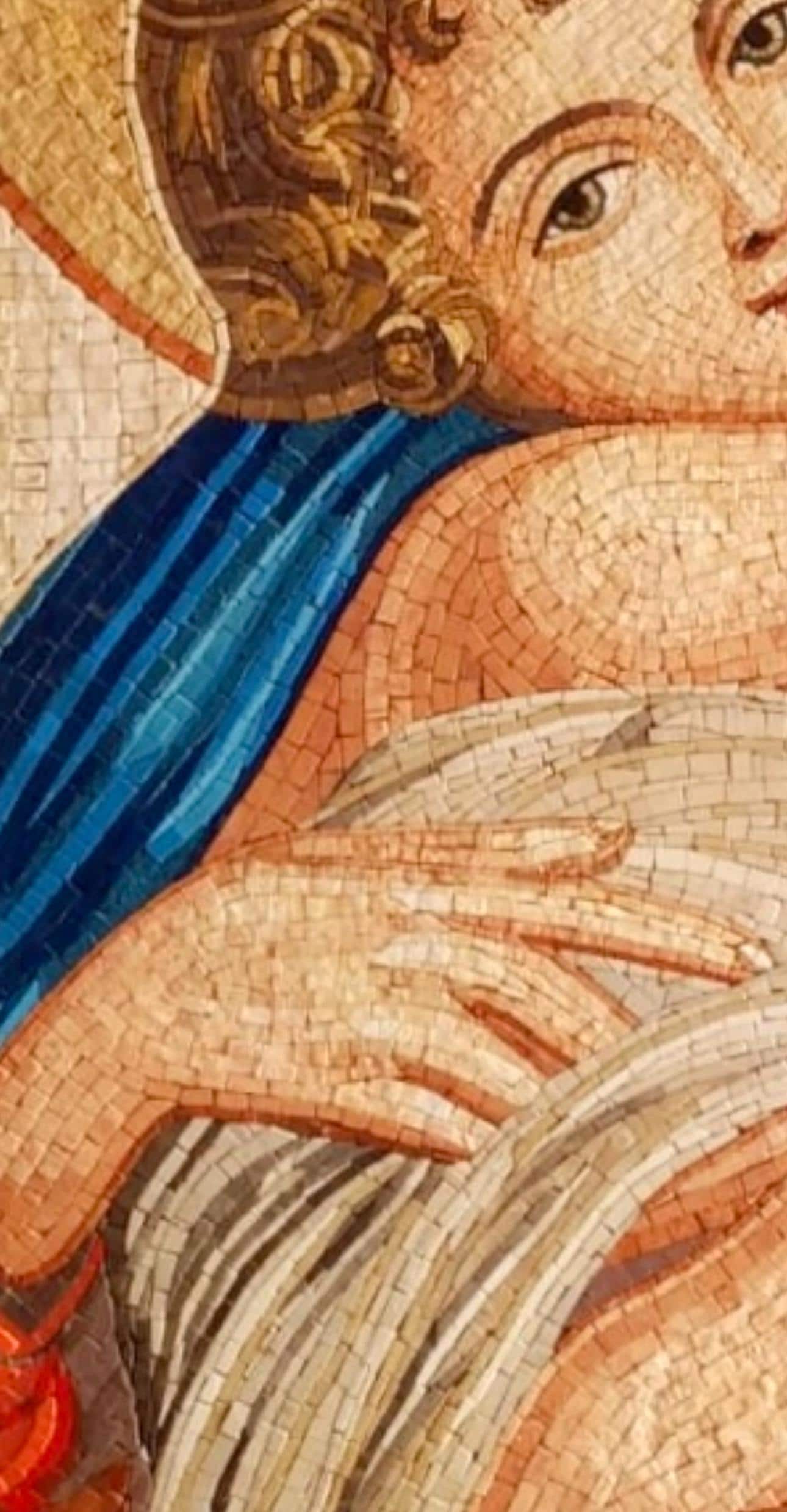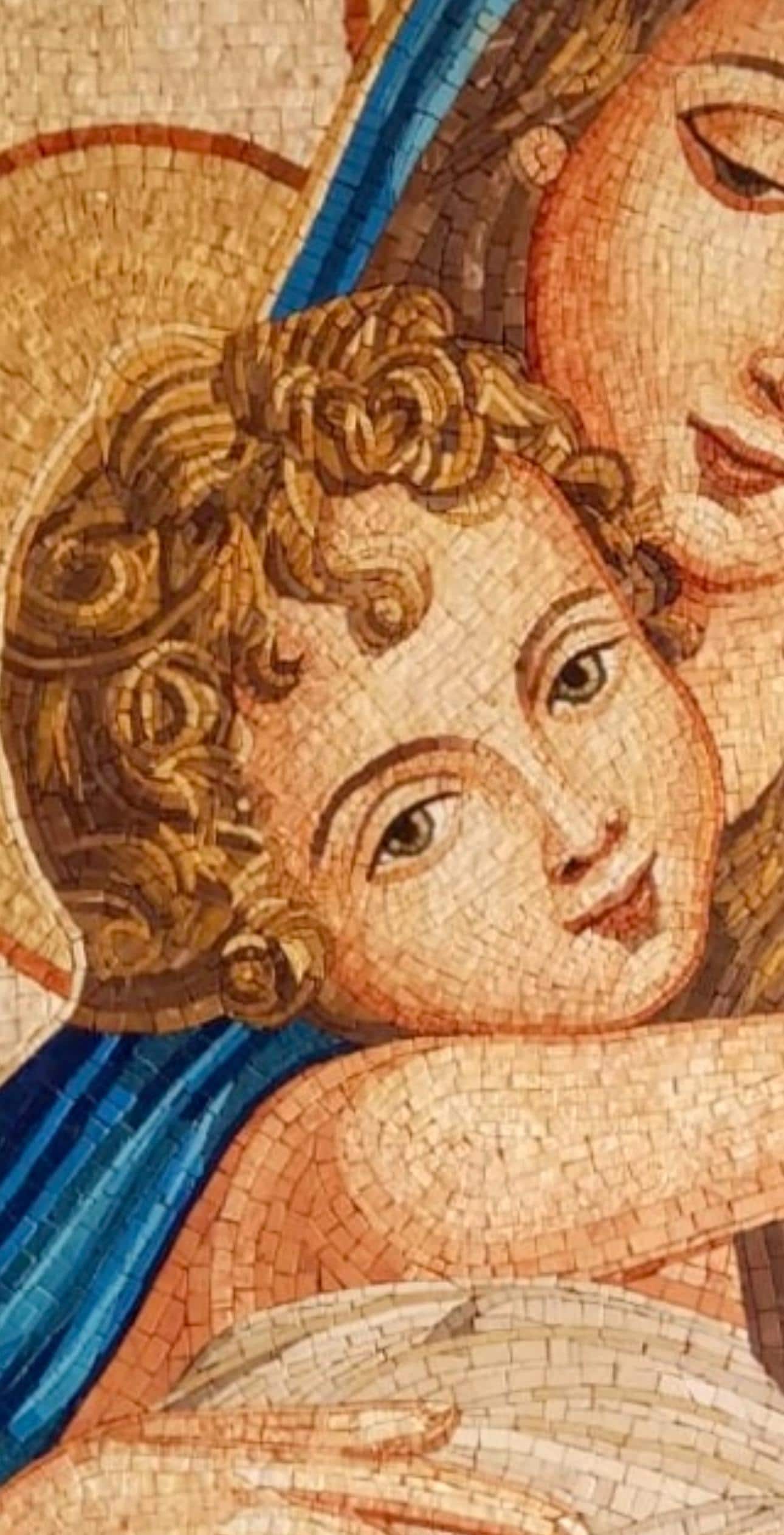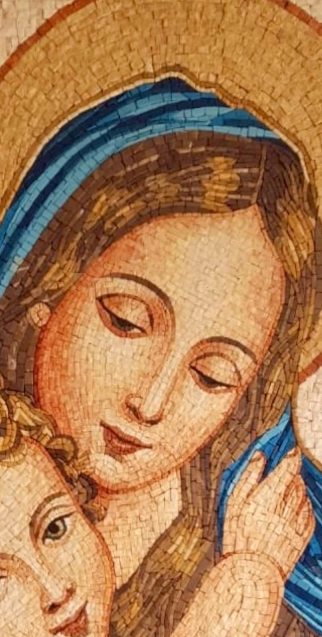 This exquisite handmade mosaic of the Virgin Mary and Child is crafted from natural marble and stone tesserae, skillfully arranged to capture timeless warmth and devotion. Each piece is individually cut and placed by hand, creating depth, texture, and radiant color harmony reminiscent of Byzantine and Renaissance sacred art.