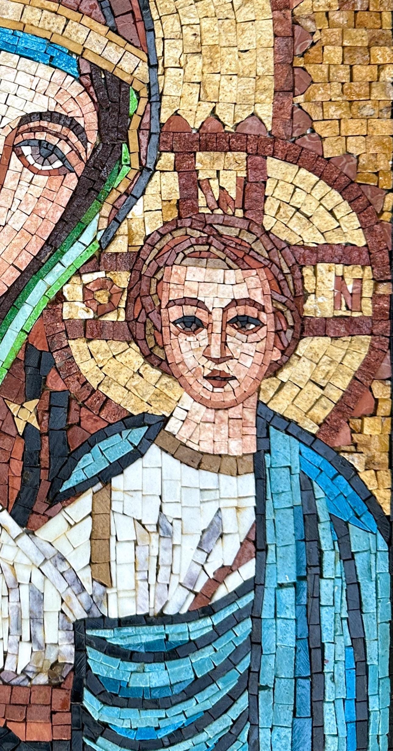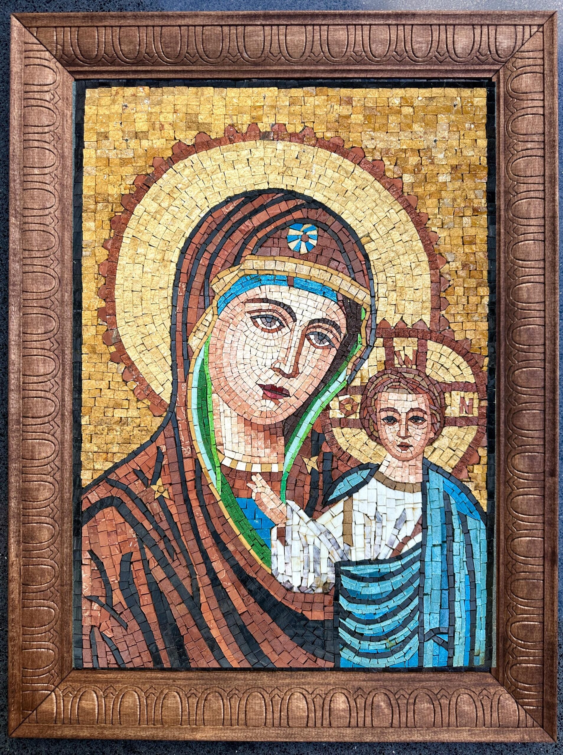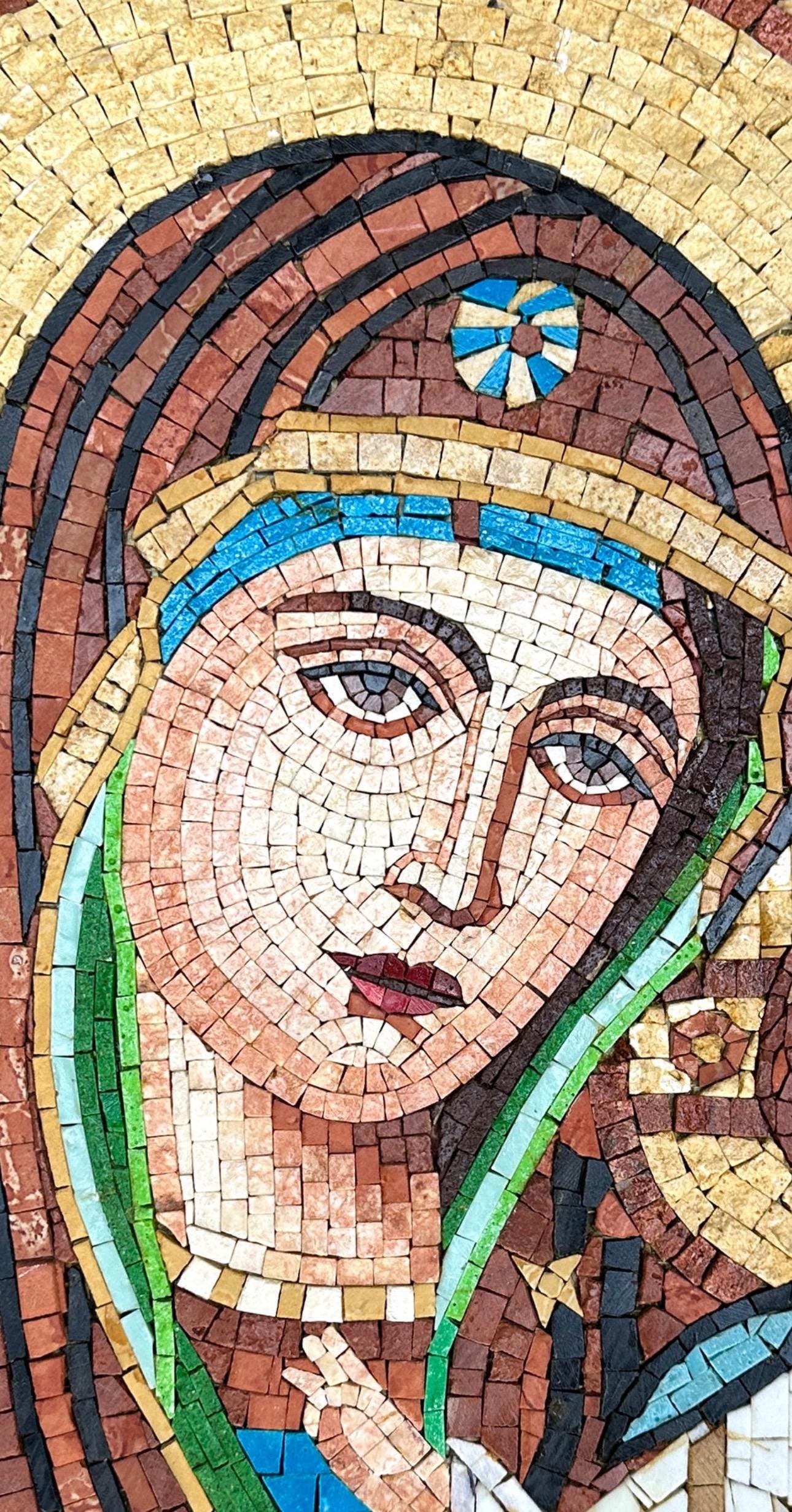 Celebrate the sacred bond between mother and child with this handcrafted Mary and Jesus mosaic artwork. Created from carefully cut natural stone and marble pieces, this piece radiates vibrant color and timeless devotion. The intricate crowns, starry halo, and detailed expressions capture the beauty and serenity of this beloved Christian icon.
