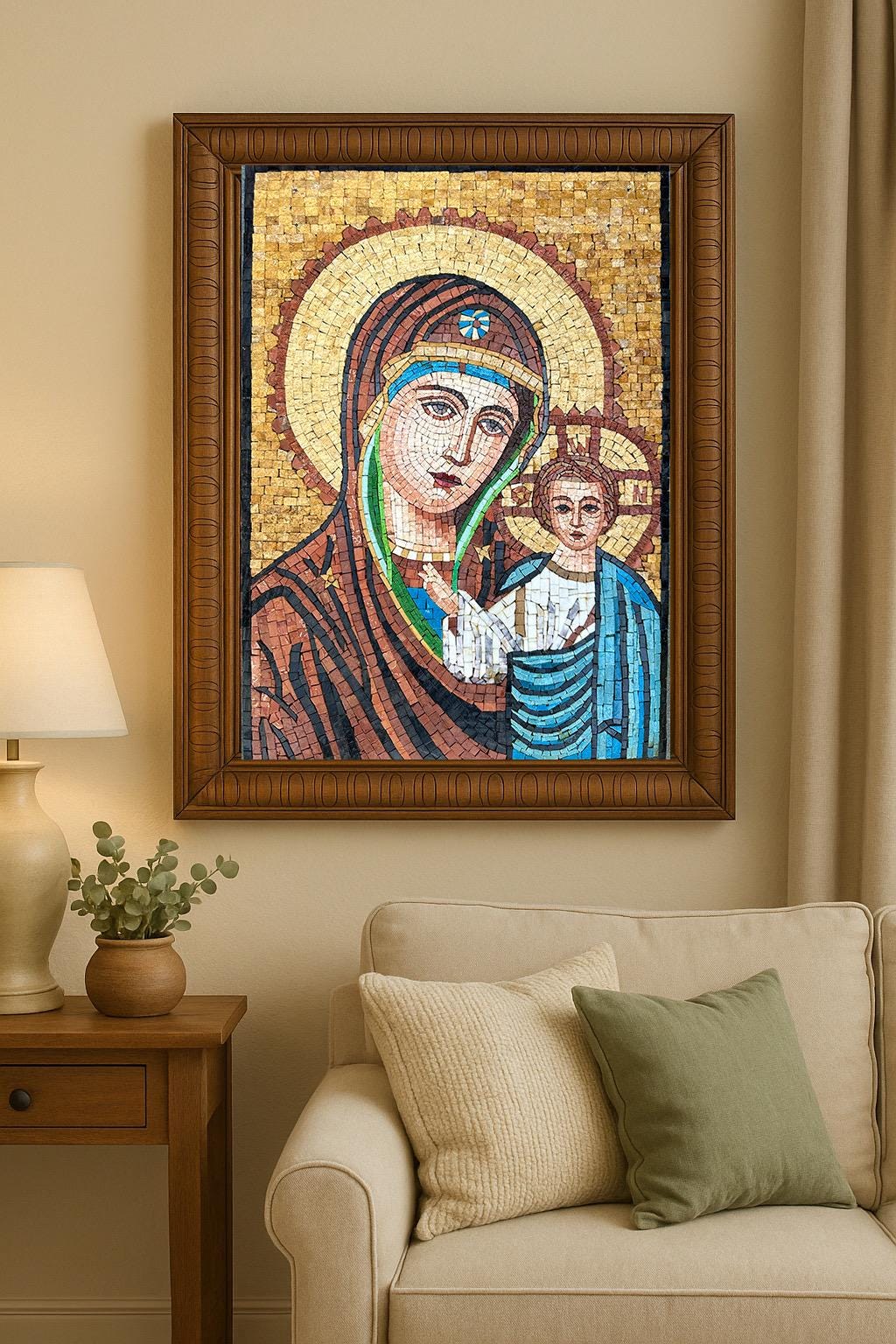 This framed mosaic is perfect for prayer rooms, chapels, or as a meaningful centerpiece in any home. Its vibrant colors and spiritual symbolism make it a powerful devotional piece or an extraordinary gift for baptisms, confirmations, or housewarmings.