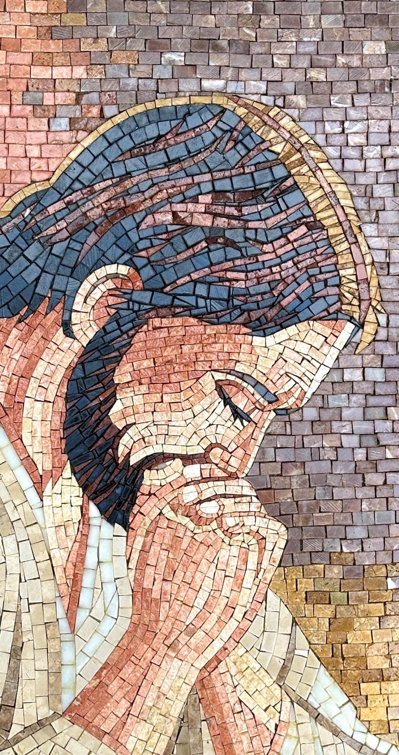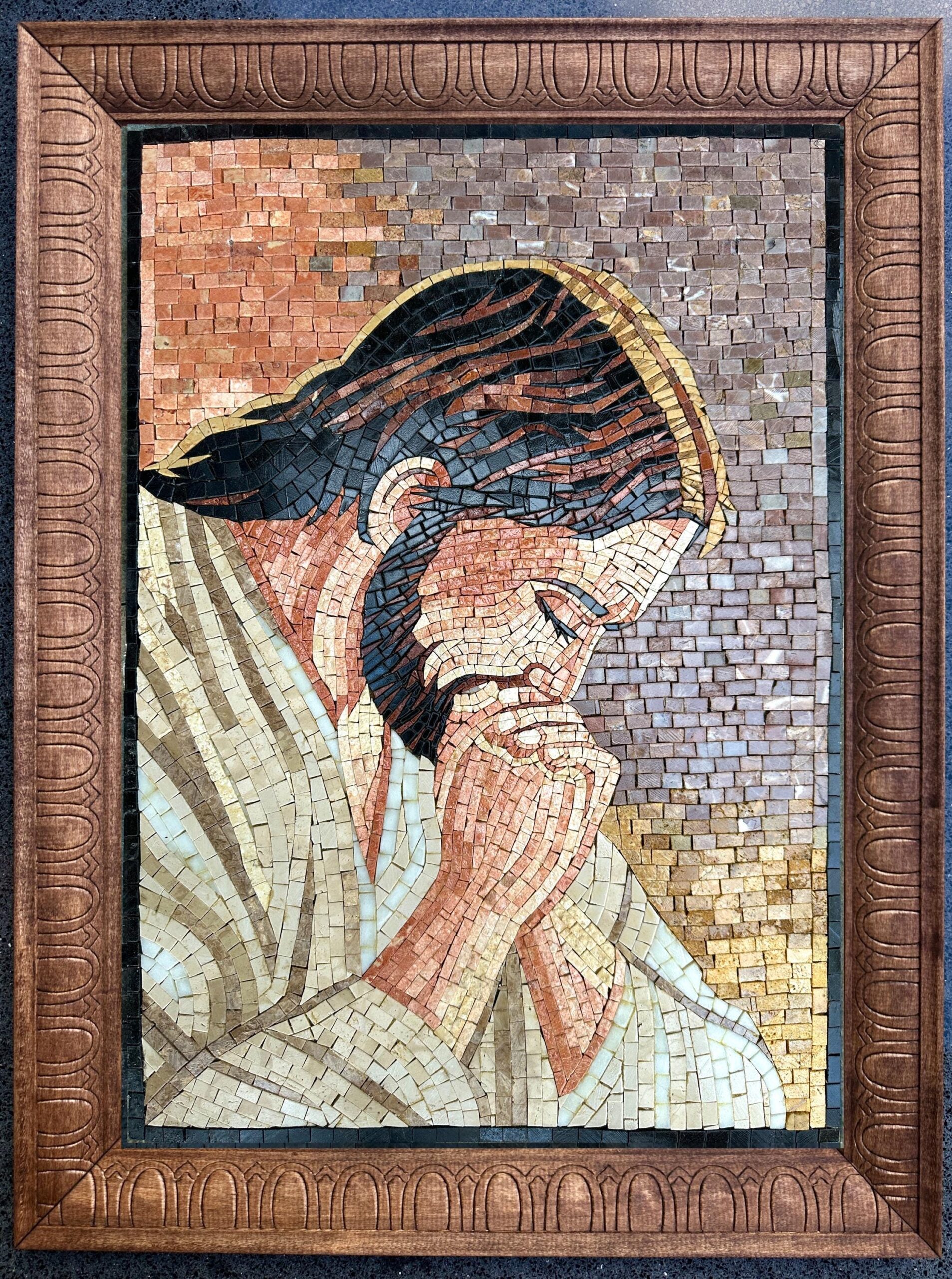 Experience the depth and emotion of this handcrafted Jesus mosaic artwork, carefully created from natural stone and marble tesserae. The design captures a powerful expression of prayer and reflection, with intricate shading and detail that bring the piece to life.