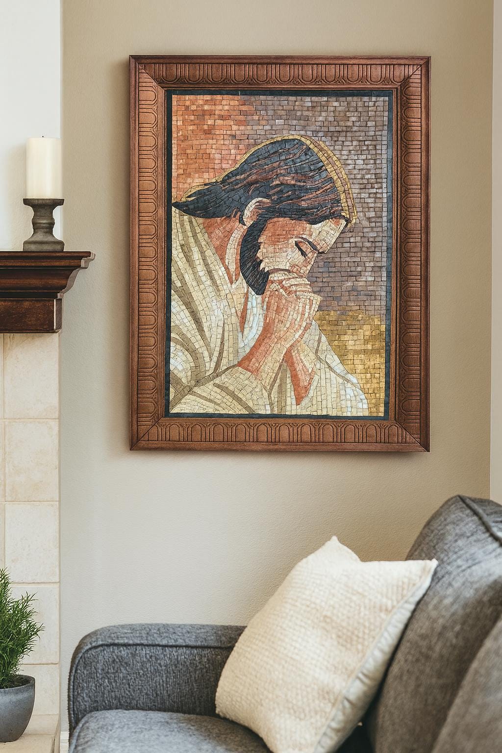 This framed mosaic is a meaningful addition to any prayer room, chapel, or living space. Its warm tones and spiritual symbolism make it a perfect devotional centerpiece or a unique Christian gift. Built to last for generations, it reflects both artistry and faith.