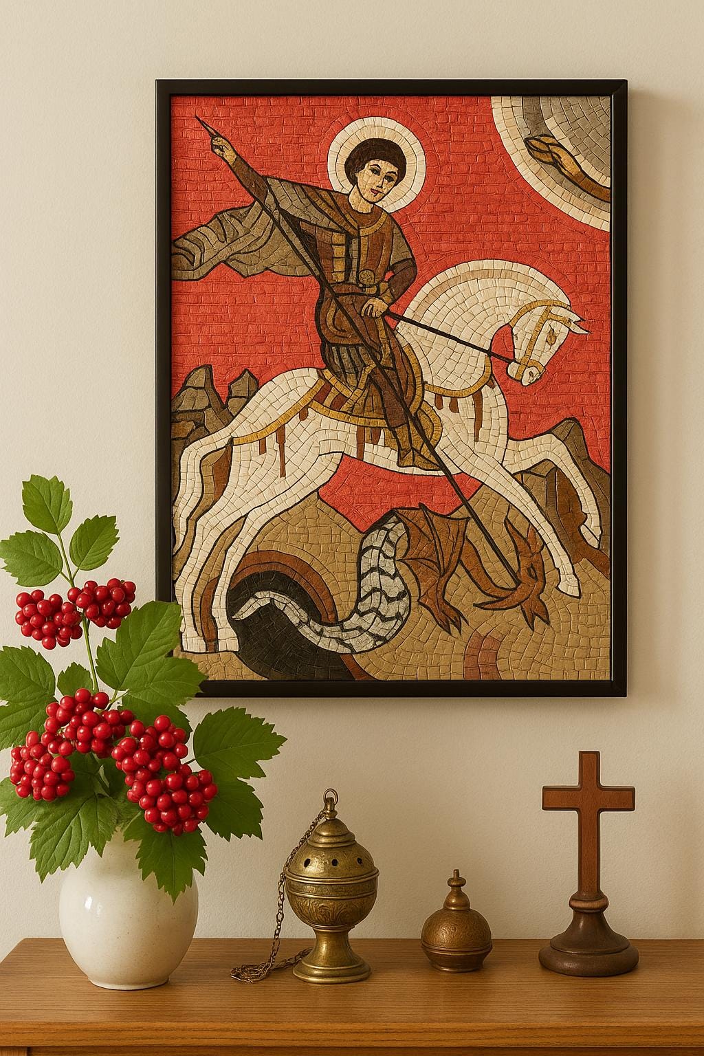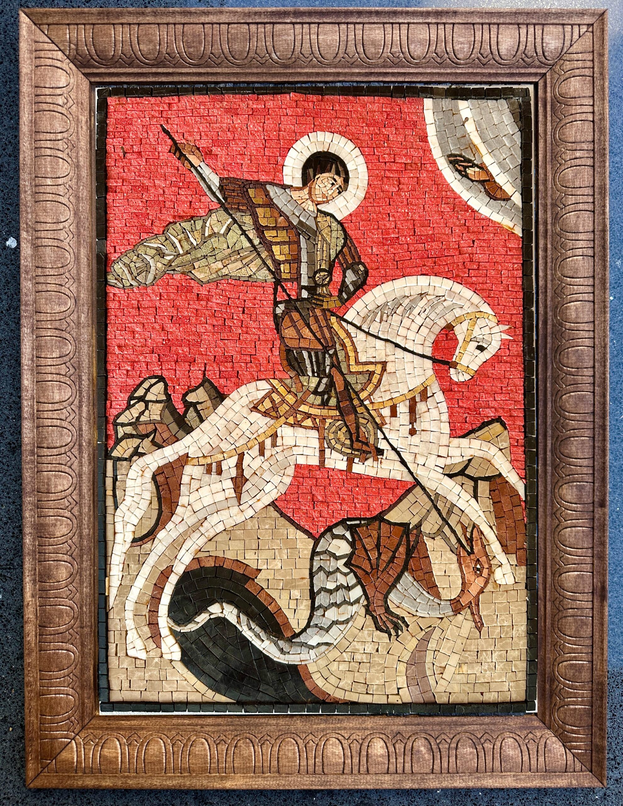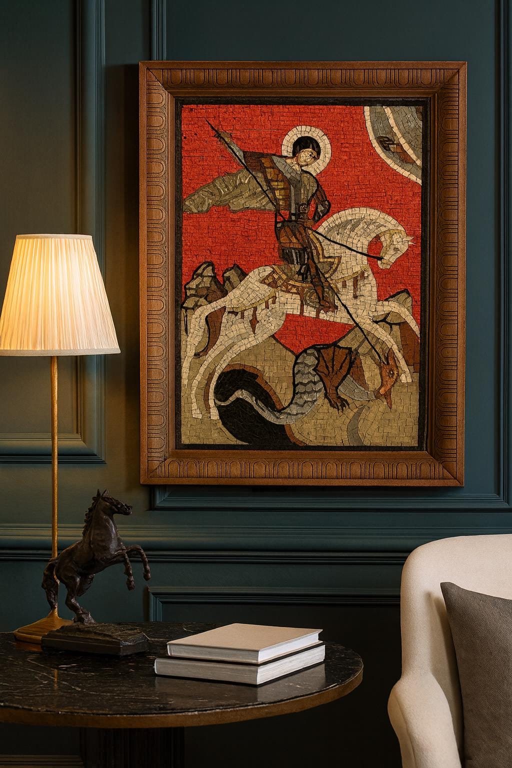 St. George defeating the dragon, a symbol of the victory of good versus evil. Beautiful and vibrant religious art piece.